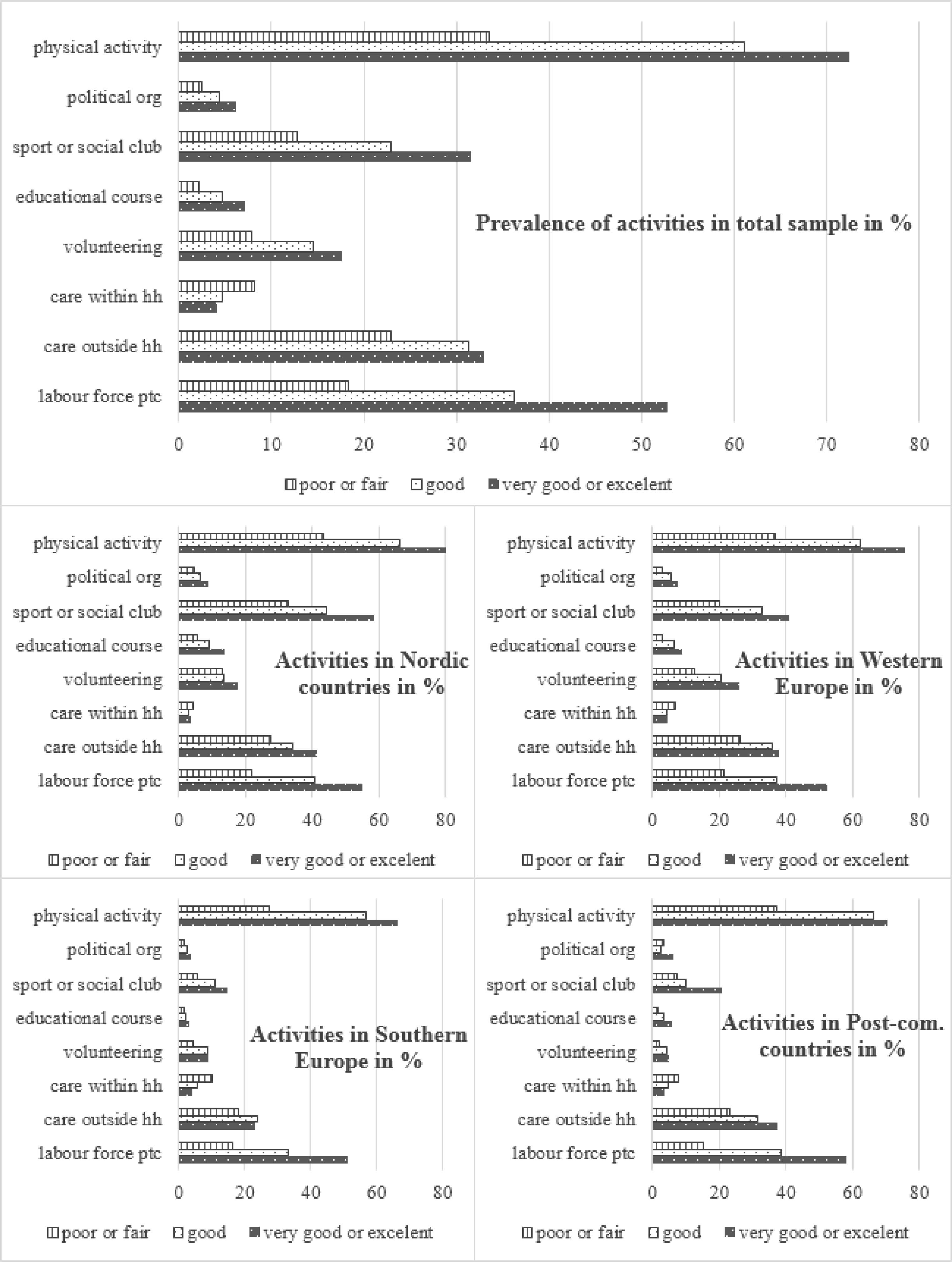 The differences between activities based on health status are displayed in Figure 4. The differences amongst groups based on health status are similar to those based on age. Nevertheless, health status is associated with activities in a more linear and often stronger way than age. All activities are substantially most prevalent for respondents with very good or excellent health, and least prevalent for those with poor or fair health, with the only exception being in caregiving provided within the household. The association of this type of care provision is reversed, as the respondents with poor or fair health provide care within the household two times more often than those with very good or excellent health. Furthermore, some differences amongst groups based on health are lower in Nordic countries (caregiving within the household, volunteering, and political organisation) and Southern Europe (caregiving outside the household) than in other European regions.