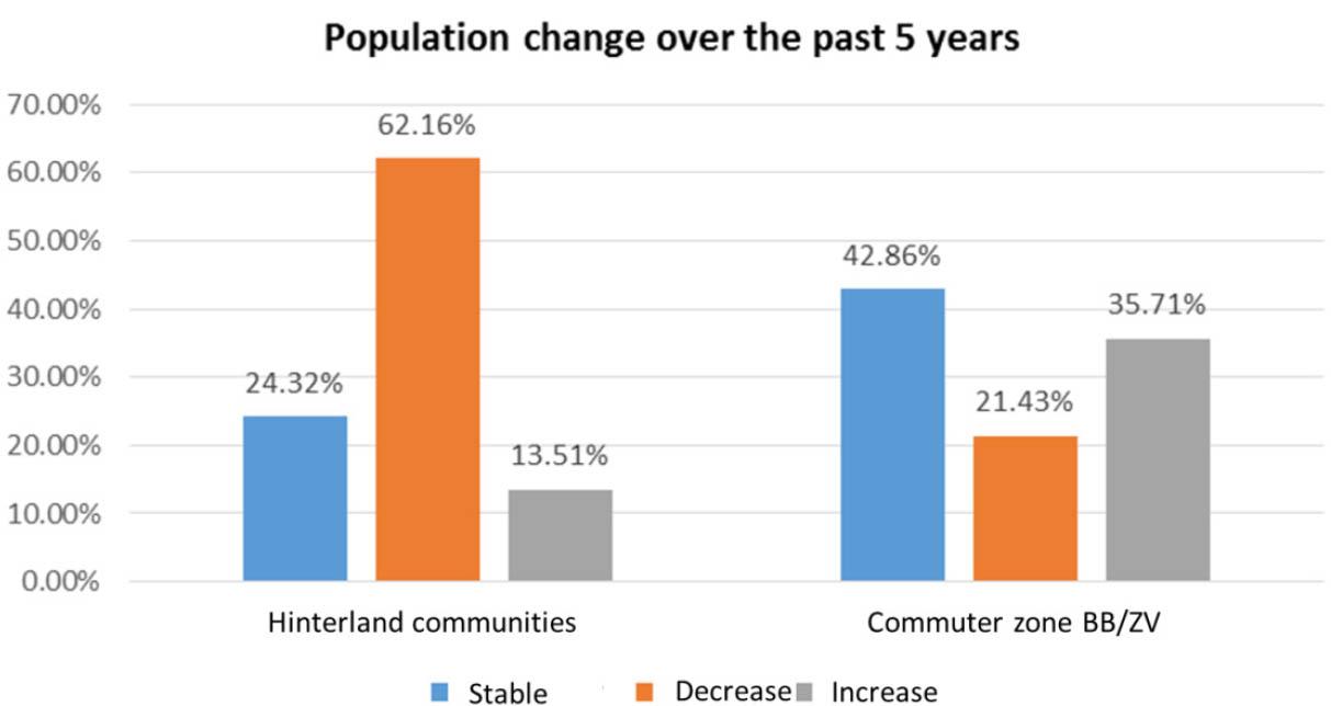 The first question our survey focused on the change in perceived numbers of inhabitants in the municipalities in the last 5 years because a loss of population would lead to abandonment (Cohen, 2001). 51% of the mayors answered that the population in their municipalities was declining; another 29% claimed that their number was stable, and only 20% of them said that there was an increase in the population. There are significant differences between the commuter zone and the hinterlands. The commuter zone reported to have stable (43%) or increasing (36%) population, while the hinterlands reported population reductions (62%) or stable (24%), as can be seen in Fig. 1.