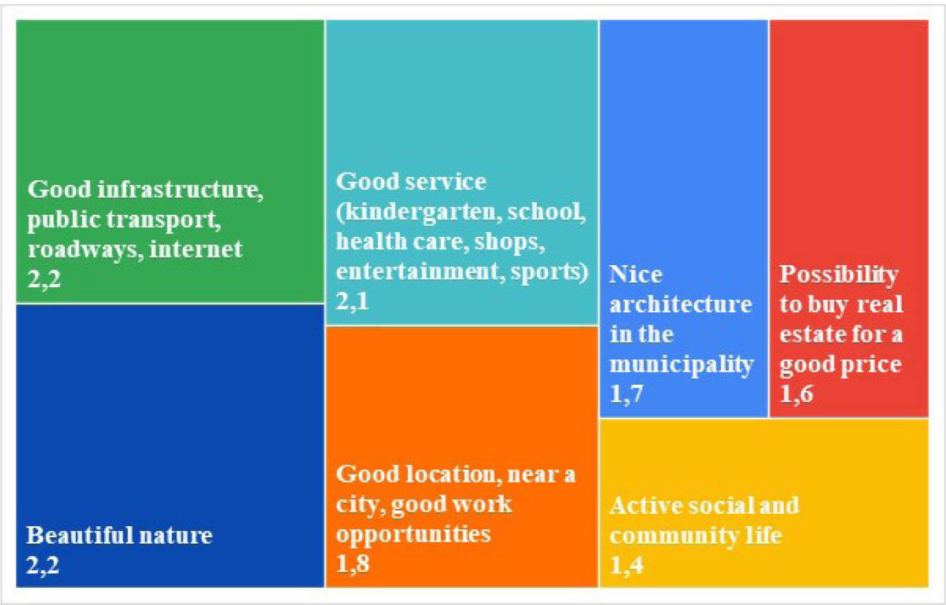 The mayors of commuter zone mentioned the good location, close to the city with plenty of job opportunities, good infrastructure and good services as the main reasons for their attractiveness. The mayors of the hinterland area cited beautiful nature, good infrastructure, and good services as the main reasons. Both groups agreed that they consider it less important: the possibility of buying real estate at a good price, a lively social and community life, or a nice architectural appearance of the village.