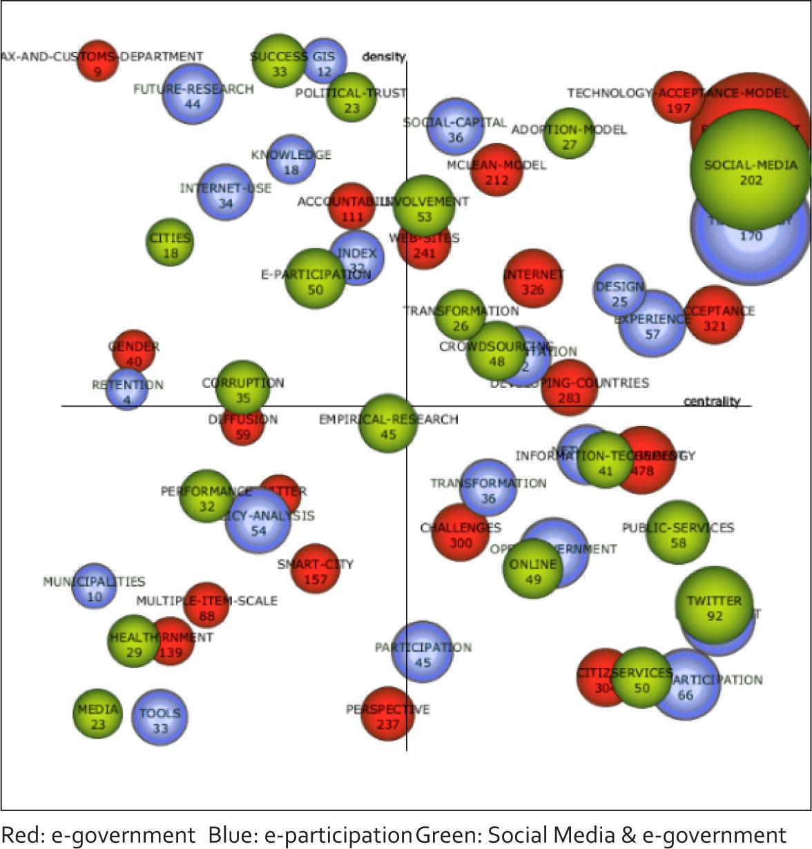 The e-government nodes (in red) show that the technology acceptance model, known as TAM (a subtheory of this model is the unified theory of acceptance and use of technology, UTAUT and the unified model of electronic government adoption, UMEGA), and Delone and McLean model appear as motor themes. In contrast, emerging topics are related to Twitter and smart cities. As to e-participation nodes (in blue), we see that the most significant node is technology, followed by social capital (related to UTAUT and trust), design (connected with participatory governance, online deliberation, and text mining), and user experience are the motor themes. Simultaneously, policy analysis (gamification, motivation), and tools (framework, communities) are the emergent themes. Also, we found well-developed and isolated themes such as GIS (geographic information system) and future research (related to co-creation, Delphi method, and real-time analysis). Concerning social media (in green), the motor themes are adoption model, transformation, and crowdsourcing. Also, we see as core themes Twitter and information technology. Political trust appears as a topic widely developed within this topic. In the emergent themes' quadrant, we found nodes related to performance and empirical research linked with literature review and meta-analysis.