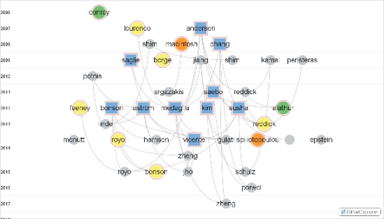 Opposite to co-citation (that shows the group of authors most relevant over the time to the discipline cited conjointly), the bibliographic coupling is beneficial to understand the most relevant authors nowadays who are citing a common reference. When we find a robust bibliographic coupling relationship, it would mean that two units share a fair amount of references. This fact could indicate that each cluster is related to a specific domain inside the research field. Another explanation is that the research field is significantly narrowed, and there is a limited number of scholars publishing in the field; hence, they end up citing the same articles. Usually, we would find the cluster dominated by the successor authors in a longitudinal citation network on the discipline (the most recent authors connected to previous authors reference-wise). For example, in the e-government research field, we find that Dwivedi and Rana appear in the same group of authors. These authors are usually publishing together on the same topics, so they likely share a reference list.