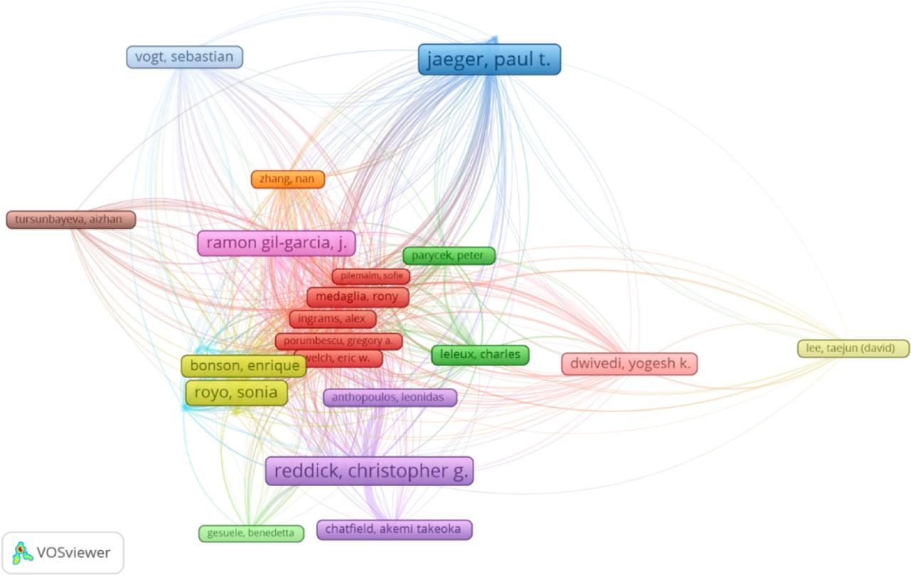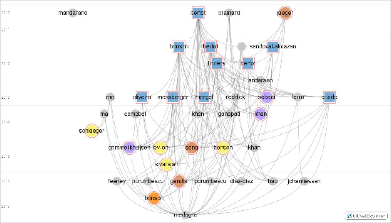 To analyze the citation network, we used CitNetExplorer software. Bibliographic coupling (useful to understand the most relevant authors nowadays who are citing a common reference) showed that there is a central cluster of authors in each research field. In the e-government topic, it is formed by Reddick, Janssen, and Gupta. The e-participation topic is formed by Pirannejad and Chiabai. The social media cluster is formed by Medaglia, Welch, Porumbescu, and Ingrams. Co-citation analysis shows the footprint or intellectual base of a research front. Based on this issue, we determine the intellectual base of the three research fields, Heeks, Macintosh, and Bertot. To understand the evolution of the citation network, we used CitNetExplorer. We detect that in the e-participation topic, the latest authors cited are Fornell, Sandoval-Almaraz, Khan, Anderson, Teorel, and Asatryan, among others. In social media, the latest authors cited are Bagozzi, Weerakkody, Sivarajah, Shareef, Dwivedi, Bryson, Abu-Shanab, et al., and Al-Sharafi. Those would be the latest trending authors according to citations.