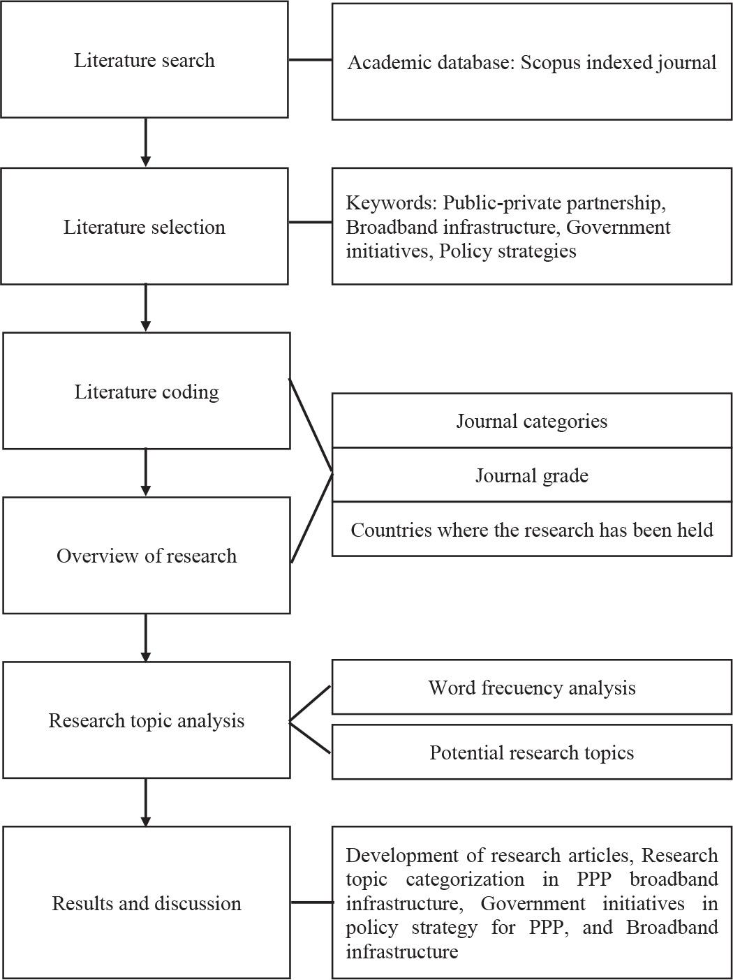 The first stage is a literature search or search process that is used to obtain relevant journal sources to answer research questions and other related references. The search process was carried out by exploring academic databases such as Scopus indexed journals. The second stage is literature selection. This stage is carried out to decide whether the data found are suitable for use in SLR research or not. Studies are eligible to be selected if they meet the following criteria: 1) data used in the 2000–2021 time period; 2) data obtained through the Google Scholar site and Scopus publications; and (3) the data used only relate to PPPs, broadband infrastructure, government initiatives, and policy strategies. The third stage is coding the literature and general description of the research. In this stage, research data are presented based on certain criteria such as journal category, journal value, and the city where the research was conducted. This stage can help classify empirical research in related fields and related topics. This is useful to assist in positioning the research and contributions provided. The fourth stage is research topic analysis which consists of analyzing word frequency and potential research topics. The research data source was taken from a Scopus indexed journal. The articles used have diverse characteristics in both writing style and diction. When the process of writing a journal article is underway, this can help the author identify journal keywords and the words that appear most frequently. Potential research topics on PPP project policy strategies come from various sources. Being aware of current issues in public affairs will help develop interesting research topics. The final stage is the results and discussion. At this stage, it is important to prepare a report that contains all the information related to the various stages of the summary and summaries of all the results are obtained.