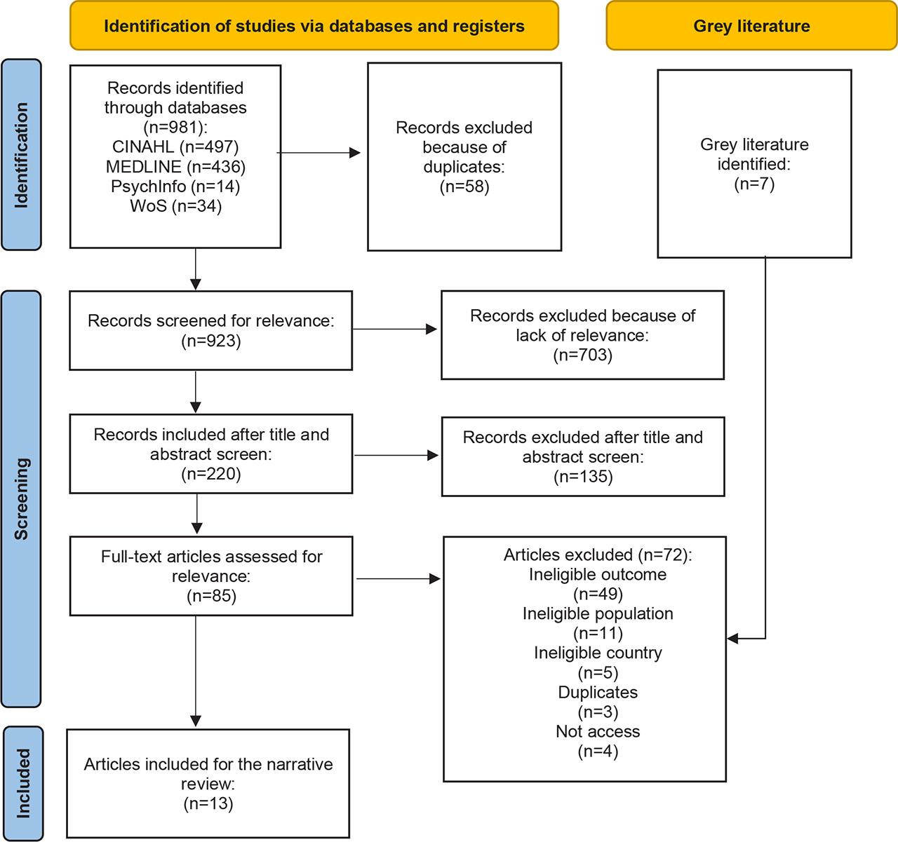 A total of 981 articles were identified. When duplicates and articles in other languages were excluded (n=58), we screened 923 articles titles and abstracts for relevance. 703 articles did not meet commitment criteria or focus on the study context (e.g., they only mapped prevalence) and were excluded. We read 220 titles and abstracts and excluded 135 because they did not fit in the inclusion criteria once the majority reported epidemiological data and do not have as main issue prevention of elder abuse. A full-text reading of the remaining 85 articles resulted in the further exclusion of 72 articles, leaving 13 articles for further analysis. Reasons for exclusion were that the retrieved several articles described the following: mortality due to violence against the elderly, PTSD as a consequence of violence against women, frailty syndrome, nutritional status and sociodemographic characteristics, shame and guilt of women after sexual abuse in the context of trauma, correlation between childhood abuse and geriatric depression, violence against women across the life cycle, childhood emotional abuse and adult depression, Mexico City, Denmark, Czech Republic or duplicates, etc.