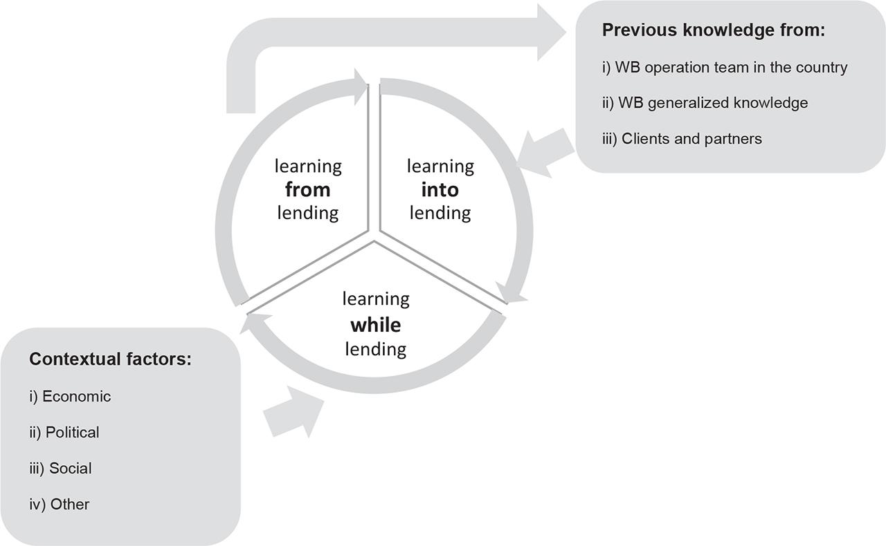 The Learning in Lending process has a looped shape with three distinct steps (or hooks). Reliance on previous knowledge represents the first hook of the loop – learning into lending. Prior knowledge consists of the existing analytical work required during the preparation and implementation of projects. This knowledge can be generic, global, and local, secured from either the WB or other actors. Furthermore, lessons learned during project implementation – learning while lending – are used to improve existing and future project outcomes. This knowledge is mainly attained through mid-term project evaluations. Finally, ex-post evaluation(s) of projects enables the WB to draw lessons from lending operations – this is what learning from lending consists of (IEG, 2014, p. 2).