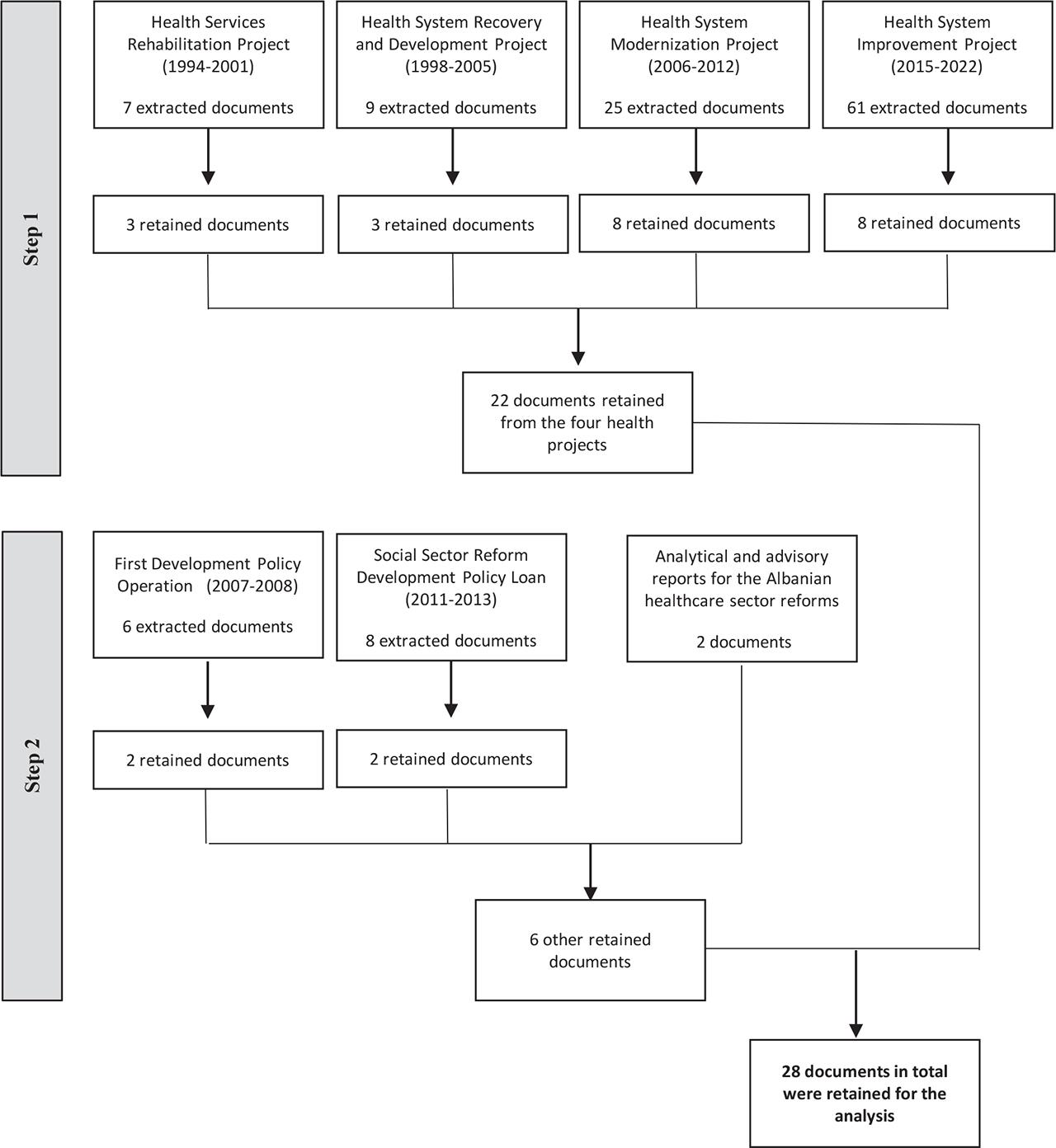 To collect relevant documents for analysis, a two-step approach was employed. The initial step involved gathering health project-related documents using the WB’s projects and operations database, (4) which provides public access to project documents across world regions and sectors. They were filtered by country (“Albania”) and sector (“health”) for the period from 1994, marking the commencement of the first WB project in health in the country, up to 2022, the most recent data available for analysis. Subsequently, a snowballing approach was used to discover new documents from existing ones. This included documents related to two lending projects in the social sector with components in the health financing reform, First Development Policy Operation (2007–2008) and Social Sector Reform Development Policy Loan (2011–2013), and two analytical reports produced for the Albanian healthcare reforms during the period under investigation, the Health Sector Note (2006) and Policy Briefs (2013). Following the criteria described above, 28 documents were retained for analysis out of a total of 118 collected documents (see Figure 2).