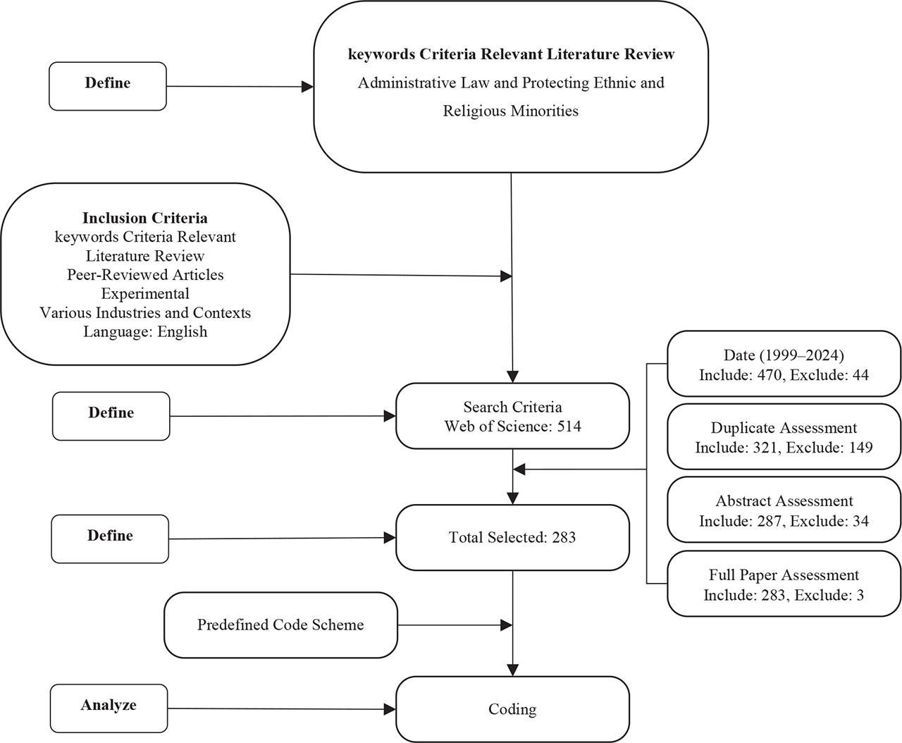 | Search terms | All= ((“Administrative Law” OR “Public Administration Law” OR “Regulatory Law”) AND (“Ethnic Minorities” OR “Cultural Minorities” OR “Indigenous Communities” OR “Marginalized Ethnic Groups”) OR (“Religious Minorities” OR “Faith-Based Communities” OR “Marginalized Religious Groups” OR “Interfaith Communities”)) |