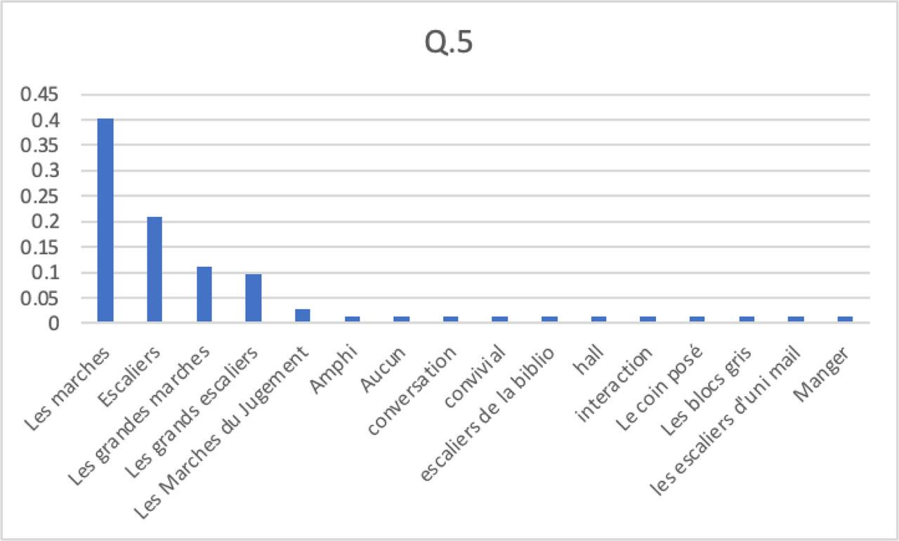 | Q.5 | Les marches, Escaliers, Les grandes marches, Les grands escaliers, Les Marches du Jugement, Amphi, Aucun, conversation, convivial, escaliers de la biblio, hall, interaction, Le coin posé, Les blocs gris, les escaliers d’uni mail, Manger |