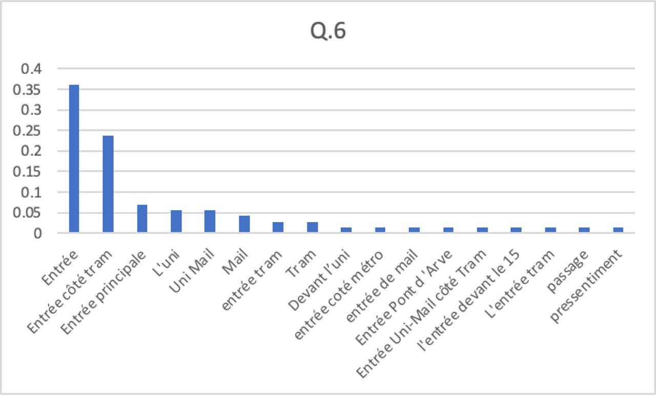 | Q.6 | Entrée, Entrée côté tram, Entrée principale, L’uni, Uni Mail, Mail, entrée tram, Tram, Devant l’uni, entrée côté métro, entrée de mail, Entrée Pont d ‘Arve, Entrée Uni-Mail côté Tram, l’entrée devant le 15, L’entrée tram, passage, pressentiment |