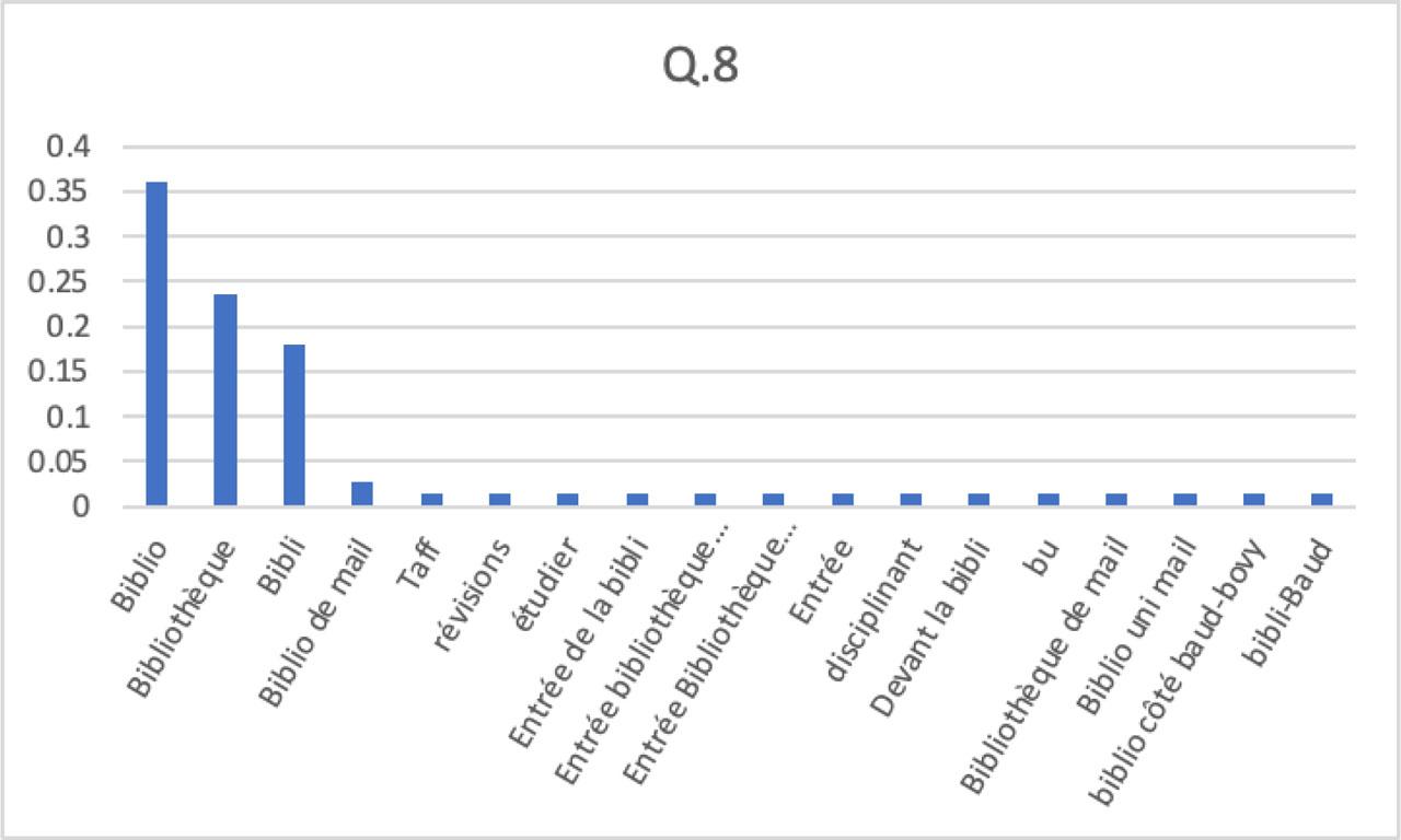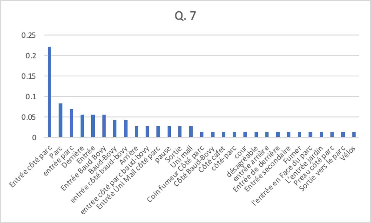 | Q.7 | Entrée côté parc, 2entrée parc, Derrière, Entrée, Entrée Baud Bovy, Baud-Bovy, entrée côté baud-bovy, Arrière, entrée côté parc baud-bovy, Entrée Uni Mail côté parc, pause, Sortie, Uni mail, Coin fumeur Côté parc, Côté Baud-Bovy, Côté cafet, côté-parc, cour |