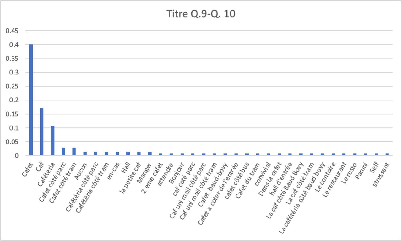 | Q.9-Q.10 | Cafet, Caf, Caféteria, Cafet côté parc, Cafet côté tram, Cafétéria côté parc, Cafétéria côté tram, en-cas, Hall, la petite caf, Manger, 2 eme cafet, attendre, caf coté parc, Caf uni mail côté parc, Caf uni mail côté tram, Cafet baud-bovy, Cafet a coter de l’entrée, cafet côté bus, Cafet du tram, convivial, Dans la cafet, hall d’entrée, La caf côté Baud Bovy, La caf côté tram, La cafétéria côté baud bovy, Le contoire, Le restaurant, Le resto, Panini, Self, stressant |