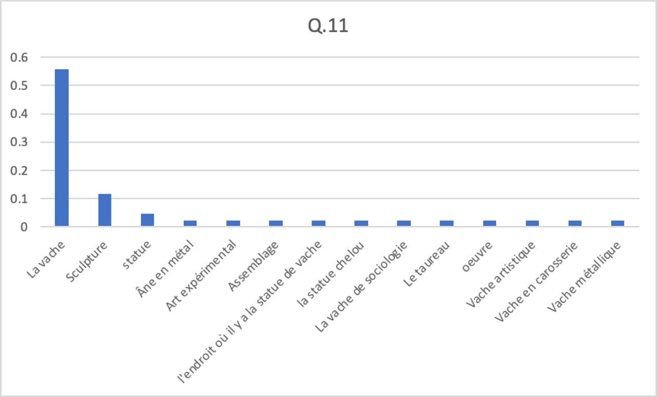| Q.11 | La vache, Sculpture, statue, Âne en métal, Art expérimental, Assemblage, l’endroit où il y a la statue de vache, la statue chelou, La vache de sociologie, Le taureau, oeuvre, Vache artistique, Vache en carosserie, Vache métallique |