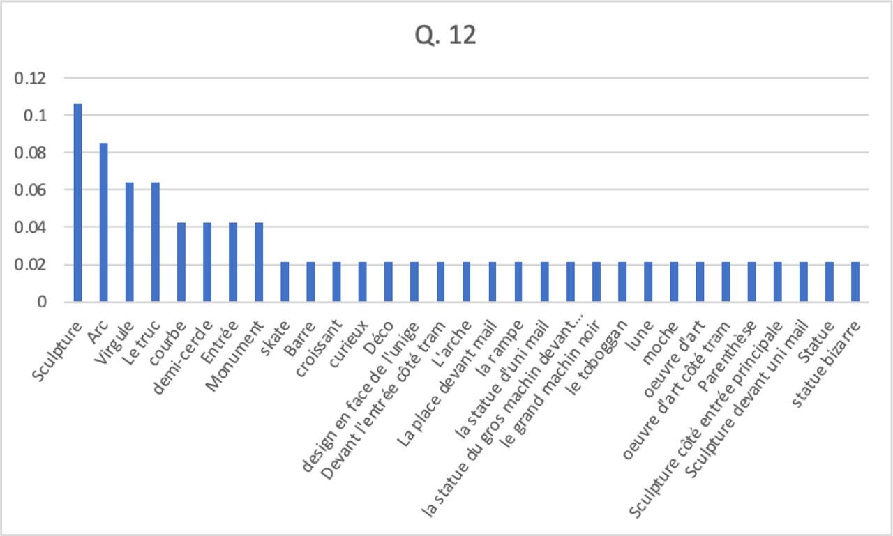 | Q.12 | Sculpture, Arc, Virgule, Le truc, courbe, demi-cercle, Entrée, Monument, skate, Barre, croissant, curieux, Déco, design en face de l’unige, Devant l’entrée côté tram, L’arche, La place devant mail, la rampe, la statue d’uni mail, la statue du gros machin devant l’uni, le grand machin noir, le toboggan, lune, moche, oeuvre d’art, oeuvre d’art côté tram, Parenthèse, Sculpture côté entrée principale, Statue, statue bizarre |