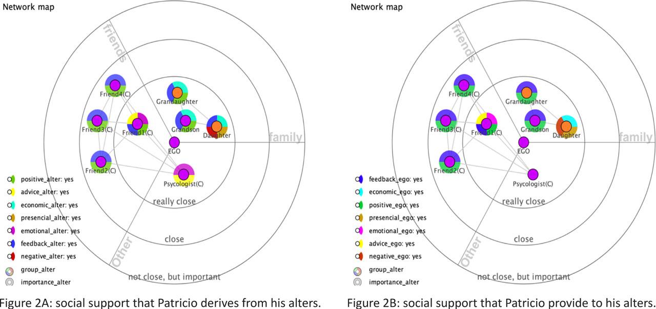 His SSN shows the presence of other types of support. For example, he recognized having a good group of friends with whom he used to have feedback and fun moments, playing a “domino” game with some of them. To illustrate, Figures 2A and 2B demonstrate, respectively, the social support Patricio derives from his alters and that which he provides to them. It could be appreciated that the negative ties as a number are tiny; however, taking into account the narratives behind these, there is so much more information that can be obtained for analysis (Table 8).
