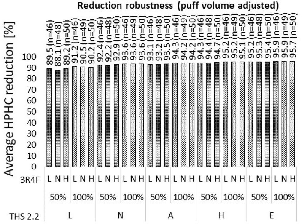 The aim of the present study was to characterize robustness by evaluating HPHC reduction consistency over multiple regimes, firstly by comparing relative reductions using the average for all investigated HPHCs, and secondly by determining the levels of reduction for each HPHC individually, with respect to predefined ‘robustness’ limits. The intention was to characterize the performance of THS 2.2 for reducing the levels of HPHCs, with a focus on puffing intensities that exceeded the intensity of the Health Canada intense (HCI) regime. It is important to understand that the volume-adjusted approach is meaningful only when used to assess products in accordance with their intended mode of operation and possible usage conditions. For instance, by design, each tobacco stick can be used in THS 2.2 for a maximum of 6 min, or for a maximum of 14 puffs, whichever comes first. Testing the product for longer than 6 min, or taking more than 14 puffs, would be incorrect and would adversely influence the determination of volume-adjusted HPHC concentrations. Most important, the objective of this study was not to determine the absolute performance for the reduction of HPHC levels in THS 2.2 aerosol compared to 3R4F smoke. Instead, the aim was to characterize the robustness of these reductions in HPHC concentrations, compared to cigarette smoke, when using THS 2.2 over a range of high intensity puffing regimes. In addition, considering the novelty of the approach, multiple smoking regimes were also applied for the 3R4F reference cigarette, in order to verify the influence of smoking regime upon volume-adjusted HPHC concentrations for cigarettes. Considering the influence of puff volume and filter ventilation on constituents yields measured in mainstream cigarette smoke (6), the possible lack of robustness for volume-adjusted HPHC yields in 3R4F smoke required a careful consideration when determining the robustness for HPHC reductions in THS 2.2 aerosol.