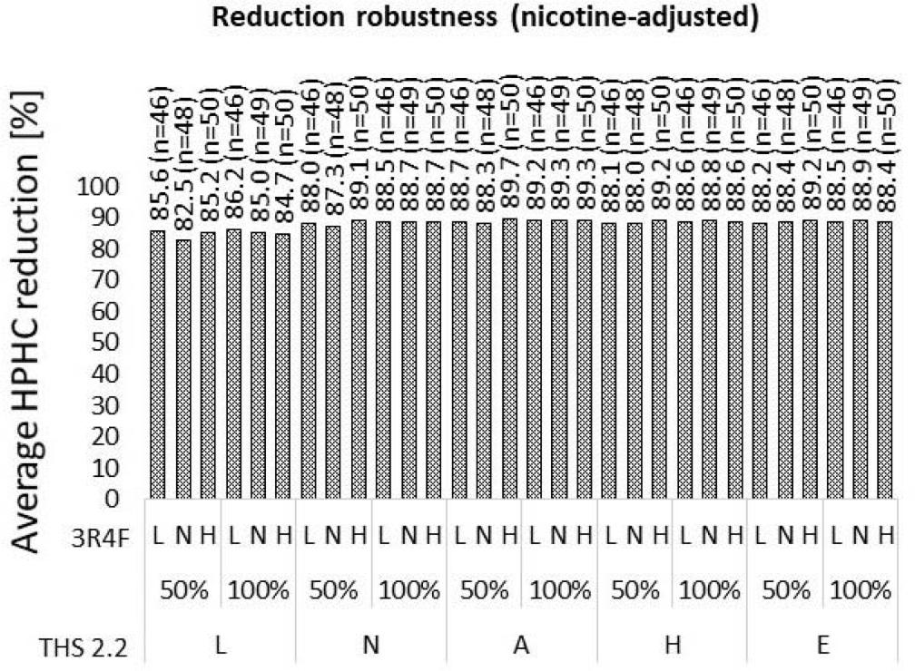 The concept of threshold limits applied for robust concentration reduction was introduced to categorize each HPHC investigated in THS 2.2 as a function of its demonstrated level of robust reduction. Based on the outcome of this study, the puff volume normalization approach is considered appropriate for the machine-smoking evaluation of the robustness for HPHC reduction in future assessments of similar products, where the nicotine-adjusted yield approach would not be applicable. For the assessment of the robustness under HCI and more intense regimes, which exclude therefore the ISO regime, the use of the 3R4F reference cigarette with 100% blocked filter ventilation is recommended. Under these specific conditions, THS 2.2 showed robust performance in the reduction of the levels of HPHCs and, regardless of the puffing regime, could remain within the respective limits identified by the present study for each relevant compound (c.f. Table 4).