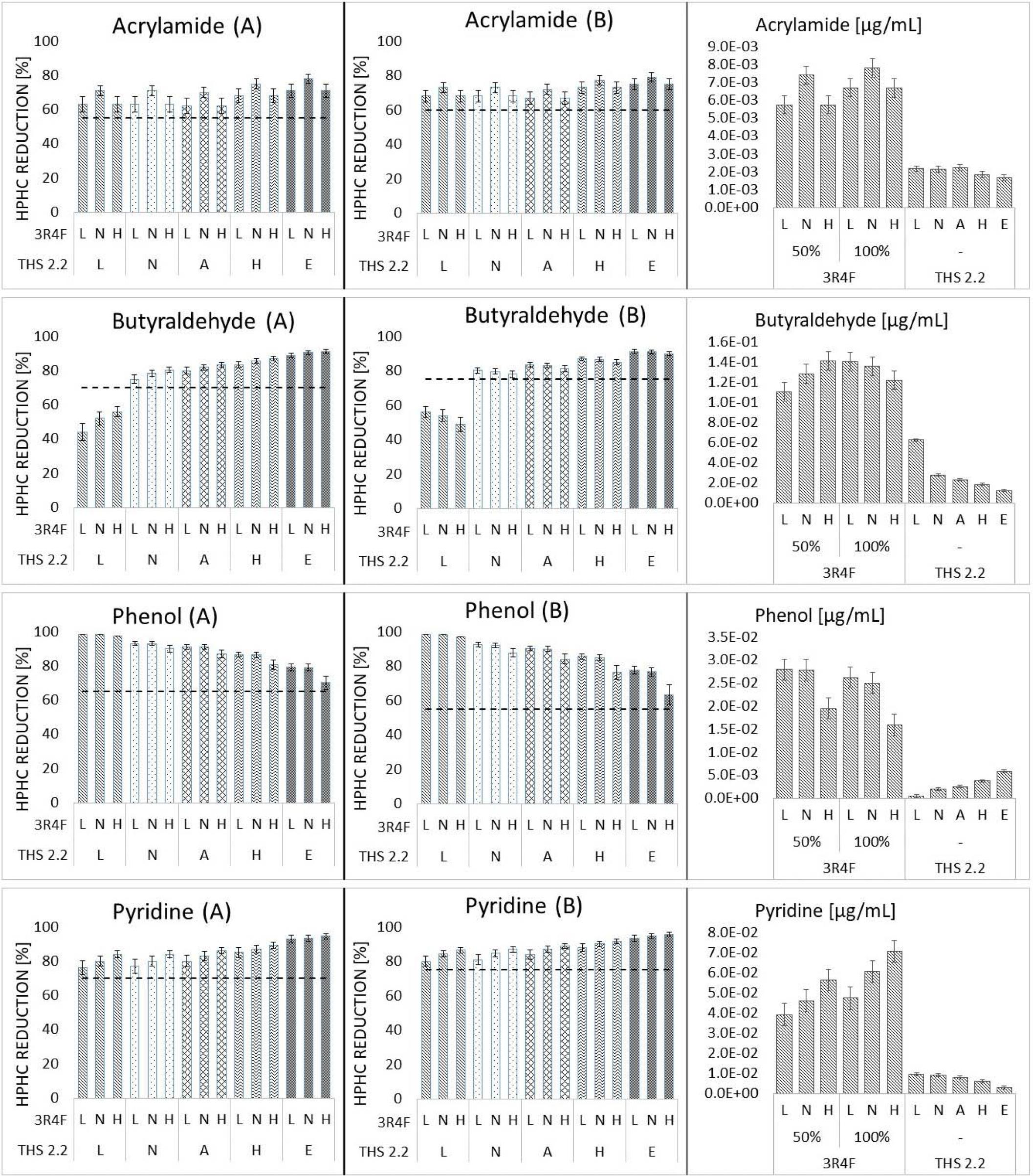 HPHC reduction with 0.95 confidence interval (error bars) calculated for 3R4F filter ventilation occlusion of 50% (A) and 100% (B). The dashed lines indicate the lower limit of reduction defined for THS 2.2 under HCI and more intense regimes. Charts on the right hand side are individual means of aerosol/smoke concentrations determined for each product and condition. The respective puffing conditions identified by A, E, H, L and N are described in Table 1 and Table 2.