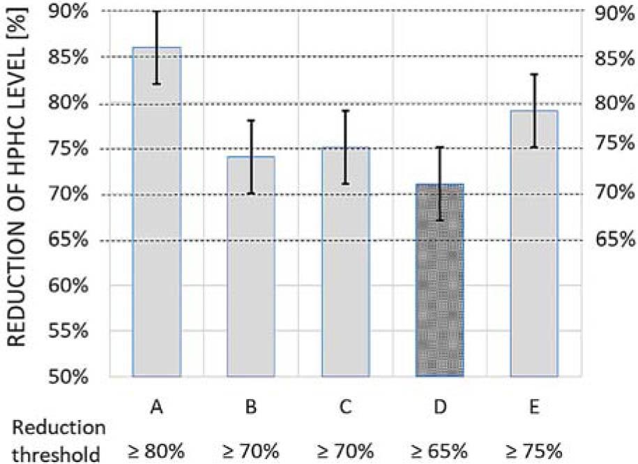 Example of the non-inferiority test used in the determination of threshold of robust reduction across A, B, C, D and E conditions. Error bars delimit 0.95 confidence intervals of the means. The lowest-bound (D) is right above 65% and the considered HPHC therefore belongs to the corresponding threshold category (i.e., ≥65%).