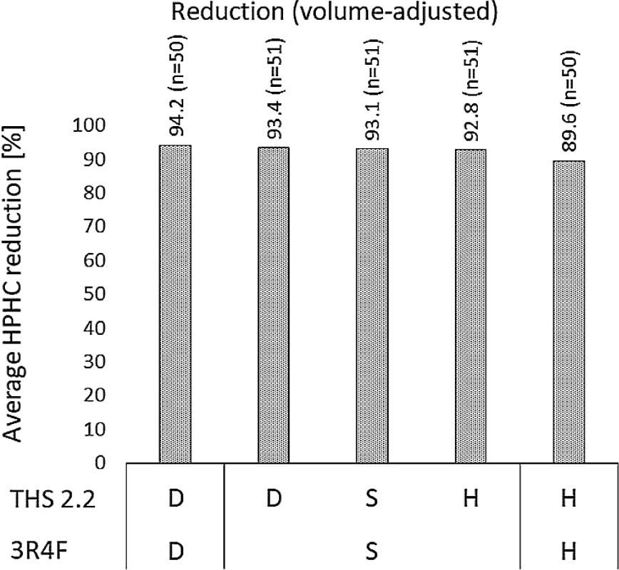 For each of the five combinations, the average reductions were calculated for both nicotine-adjusted and volume-normalized yields by using the combined data of all measured HPHCs.