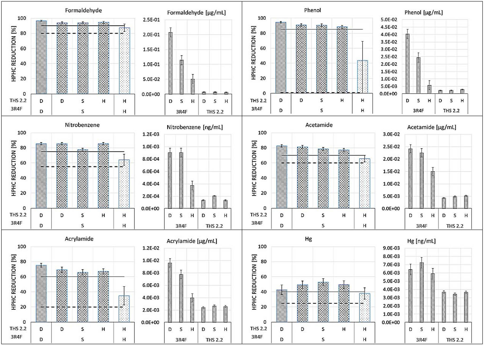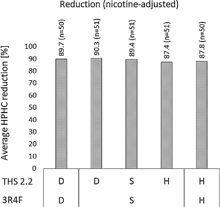 The concept of thresholds applied for robust concentration reduction was introduced in a previous study (16) to categorize each HPHC investigated in THS 2.2 as a function of its demonstrated level of robust reduction. The same methodology was adopted in this study, and, as expected, THS 2.2 showed a robust performance in terms of HPHC reductions.