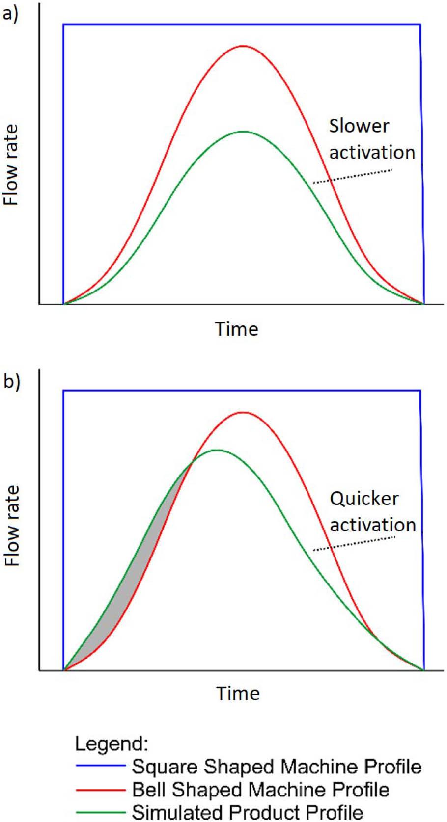 Puff profile diagrams (why square was favoured). Common puff profile algorithms for aerosol collection compared to possible device puff profile shape. In Figure a) the device has a relatively slow start-up. Square-shaped and bell-shaped machine profiles would give similar yield results. In Figure b) the device has a relatively quick start-up time, and the bell-shaped profile may give lower yields than the square-shaped profile.