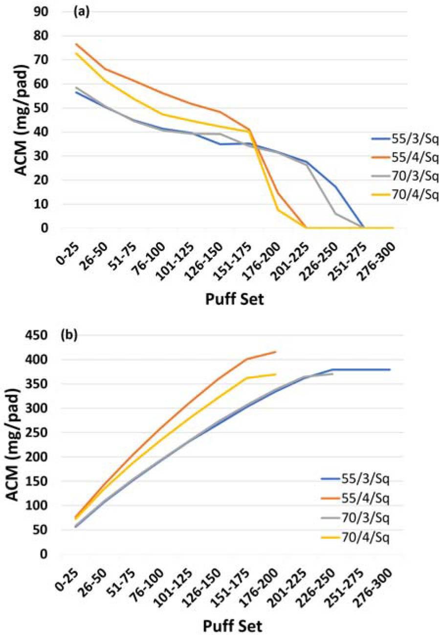 The ACM was collected discretely rather than in total; 25 puffs were collected per pad up to 300 puffs. With this collection scheme, delivery profile trends may be assessed. While the overall yields were similar among the regimes, the delivery profiles show that there was an impact on puff blocks from choice of puff duration (3 s versus 4 s). On the other hand, puff volume did not appear to impact the delivery profile. This trending is exemplified in Figure 2 for one of the samples. Trend lines for the regimes using 3-s duration, 55/3/30/square and 70/3/30/square, are virtually identical. The trend lines for the 4-s duration regimes, 55/4/30/square and 70/4/30/square, also group together. Note also that the 4-s trends have higher yields and fewer puff blocks than the 3-s trends.