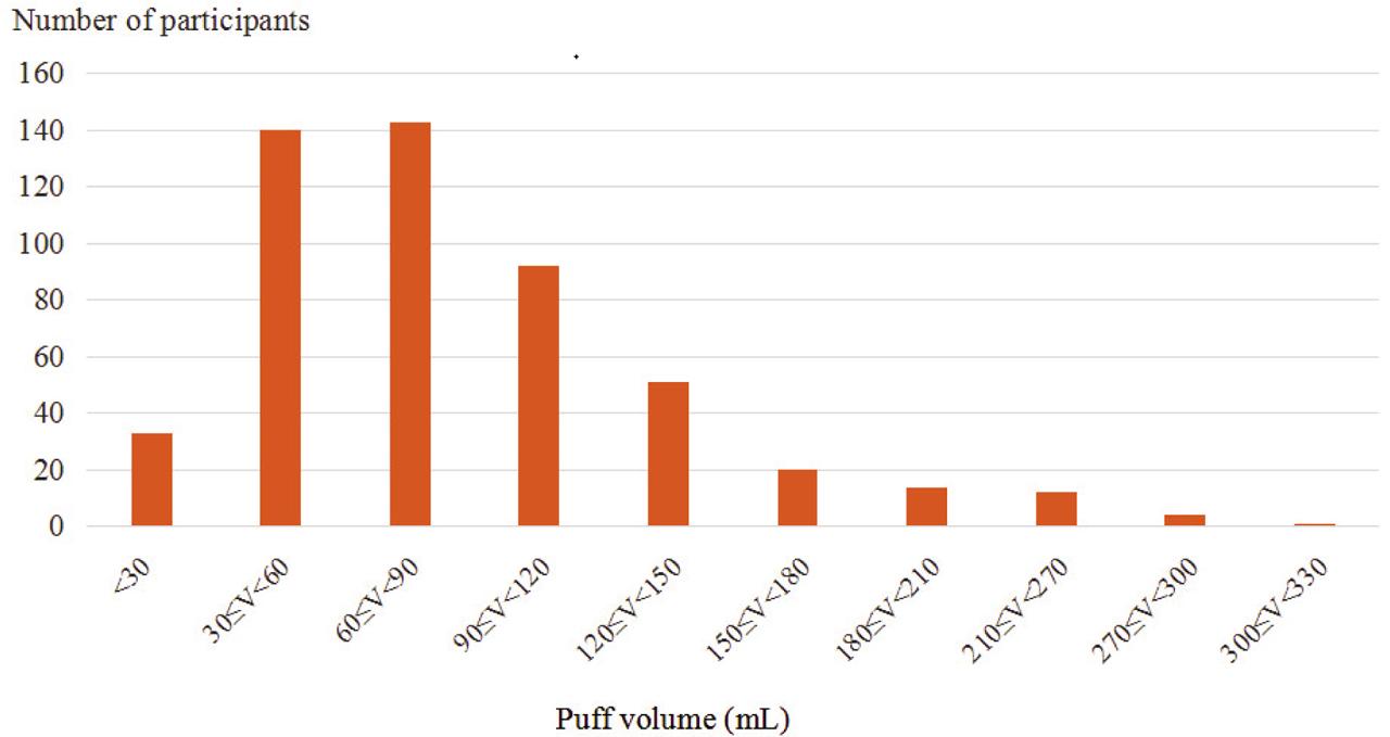 The percentages of puff volume of < 30, 30 ≤ V < 60, 60 ≤ V < 90, 90 ≤ V< 120, and ≥ 120 mL were 6.5%, 27.4%, 28.0%, 18.0% and 20.1%, respectively. Overall, puff volume of 73.4% participants was in the range of 30–120 mL.