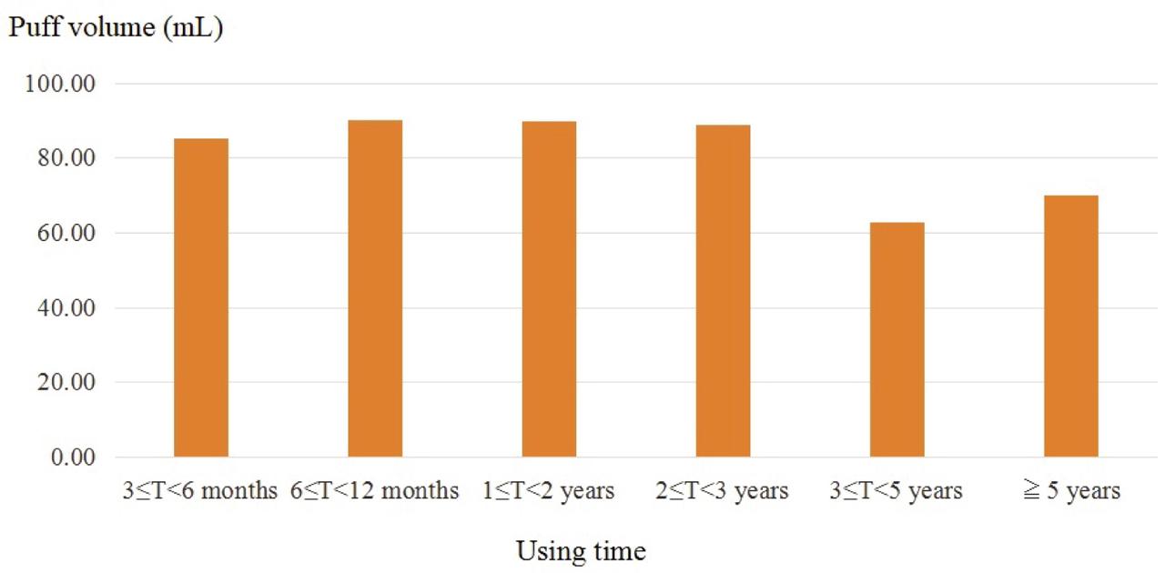 Overall, with the increase of the time span the participants used ECs, the puff volume first increased slowly, then remained stable and finally decreased notably. The results showed that there were significant differences between the puff volumes of longtime consumers of ECs of e.g., 3–5 years and and those who used ECs for shorter periods of time as e.g., 6–12 months 1–2 years, 2–3 years (p = 0.01, 0.01 and 0.03, respectively). The reason of this finding is still unclear. Puff duration did not vary with duration of use, with the average values of 2.02, 1.98, 1.96, 1.94, 1.85, 1.88 s, respectively, for users with 3–6 months, 6–12 months, 1–2 years, 2–3 years, 3–5 years and above 5 years use time.