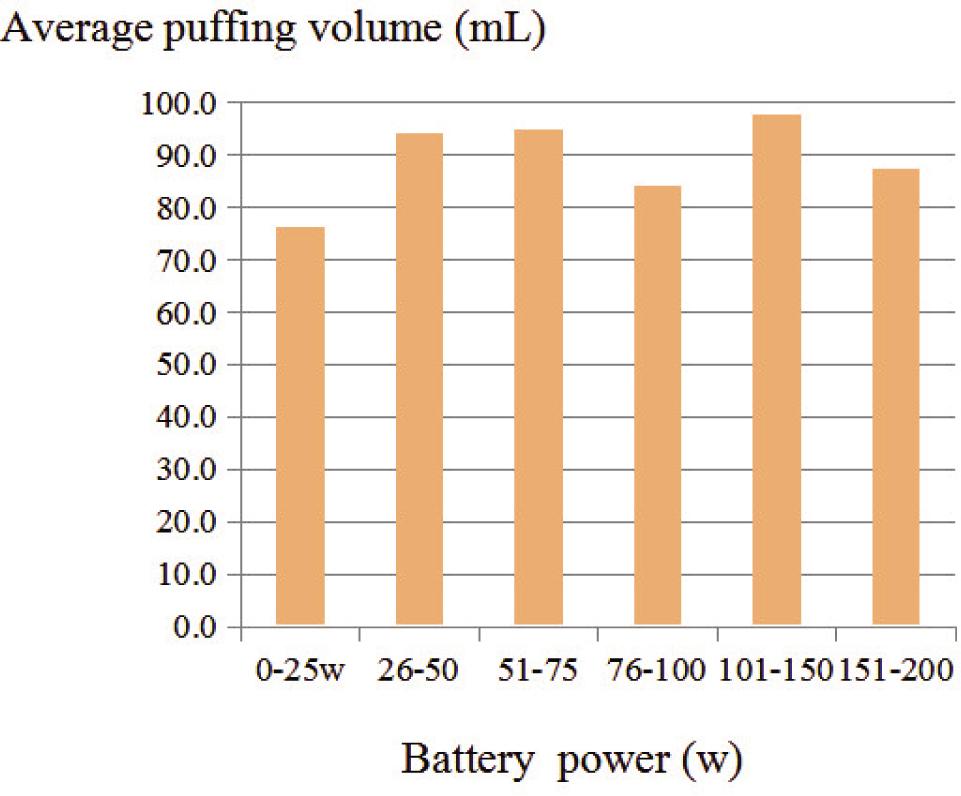 Based on the participant's self-reporting on the power of their used batteries, the relationship between the power of the tank-type ECs and the puffing topography parameters was also studied. The results are shown in Figure 3.