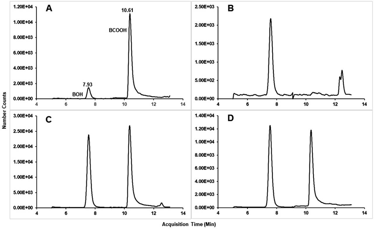 Representative chromatograms of benzyl alcohol (BOH) and benzoic acid (BCOOH) quantification transitions for (A) quality control sample low concentration, (B) HAUS Cool Ice TM, (C) JUUL Cool Mint TM, (D) labeled internal standard.