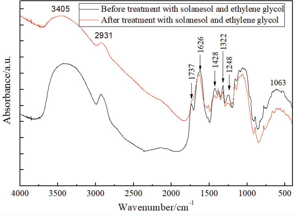 Specific surface area and pore volume of tobacco stem before and after treatment with solanesol and ethylene glycol_