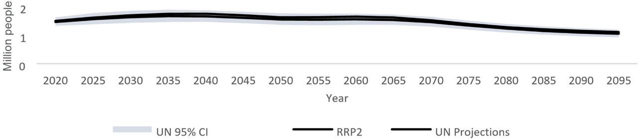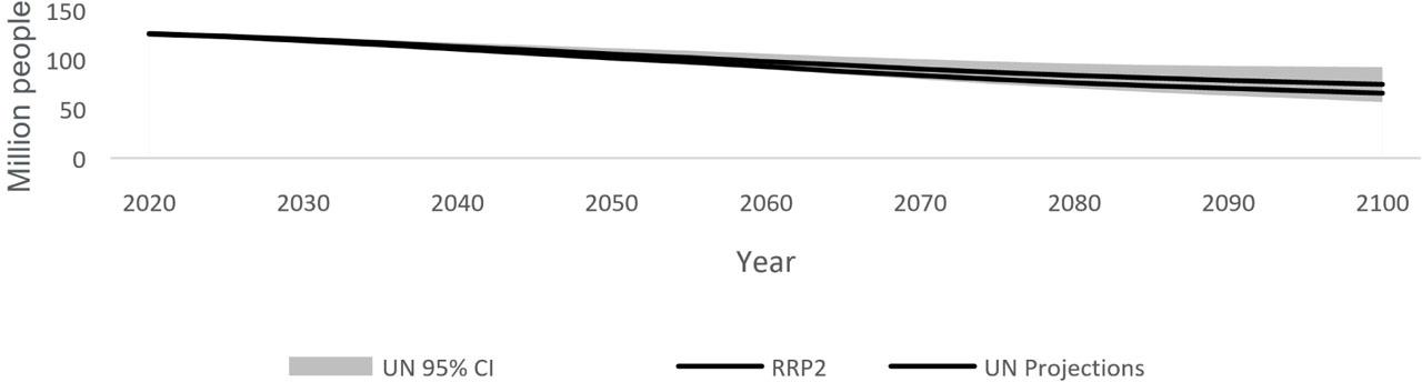 Prior to comparing scenarios, the RRP2 model’s projection results of Japan’s demographics were assessed for realism by comparing them to independent projections. The data in Table 10 provides the RRP2 model demographic projections and the graphs in Figure 2, Figure 3 and Figure 4 compare these projections against those published by United Nations projections for Japan (28). The RRP2 demographic projections were within the 95% prediction interval of those from the United Nations.