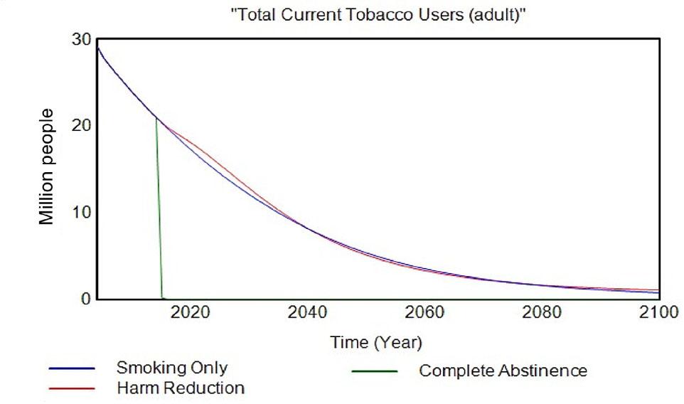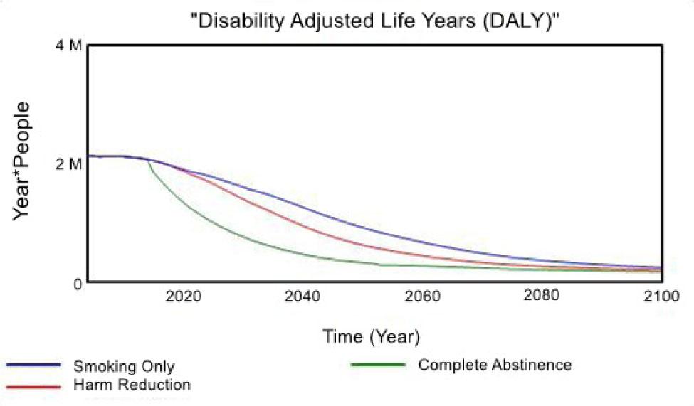 The projected number of smoking-related deaths over the period 2004–2100 in the Harm Reduction scenario was reduced to 3.8 million, down 18.3% from the total in the Smoking Only scenario (4.65 million). To place the drop into perspective, if all tobacco product use ceased from 2014 onwards, a 49% drop in tobacco-related deaths was projected. The focus of this study was to move beyond mortality indicators to project non-mortality indicators. Projected outputs added include smoker behavioural patterns, the number of years lived with disability (YLD), disability-adjusted life years (DALY) and the incidence and prevalence of diseases associated with tobacco use as defined in the Global Burden of Disease Study (18).