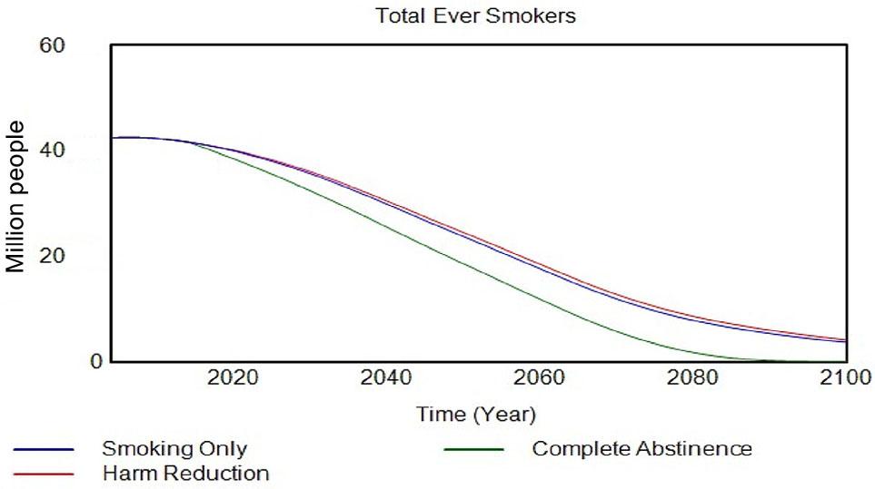 Although the average length of time spent smoking was shorter in the Harm Reduction scenario, a greater number of people had smoked at some point during their lives. The peak in this extra number of Ever-Smokers occurred around 2060, where 900,000 more people had smoked compared to the Smoking Only scenario. As we assumed only 50% of those that initiate THP would have smoked had the THP not been available, this would mean the overall rate of tobacco product initiation would be greater in the Harm Reduction scenario. As a proportion of those who initiate a THP as their first tobacco product would later transfer to smoking, a greater number of Ever-Smokers would be expected.