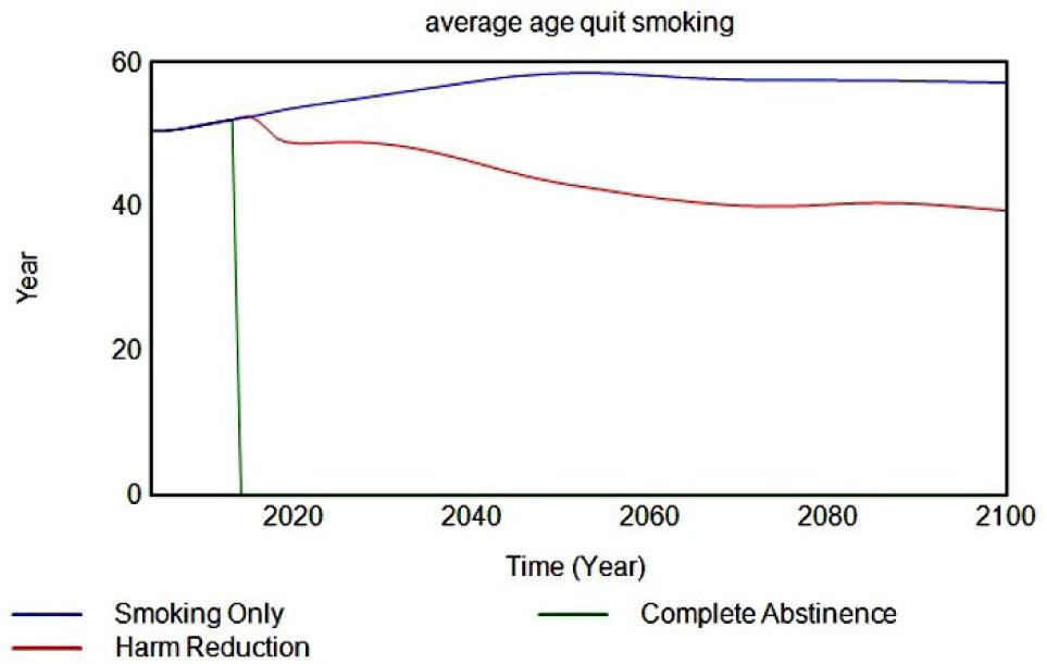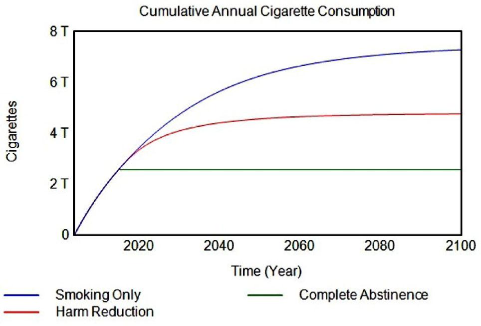 From 2030 onwards, the average age at quitting smoking was at least 7 years earlier for the Harm Reduction scenario. The reduction in the number of smokers is reflected in the consumption of cigarettes, where across 2004–2100 nearly 2.5 trillion fewer cigarettes were consumed in the Harm Reduction scenario (Figure 9).