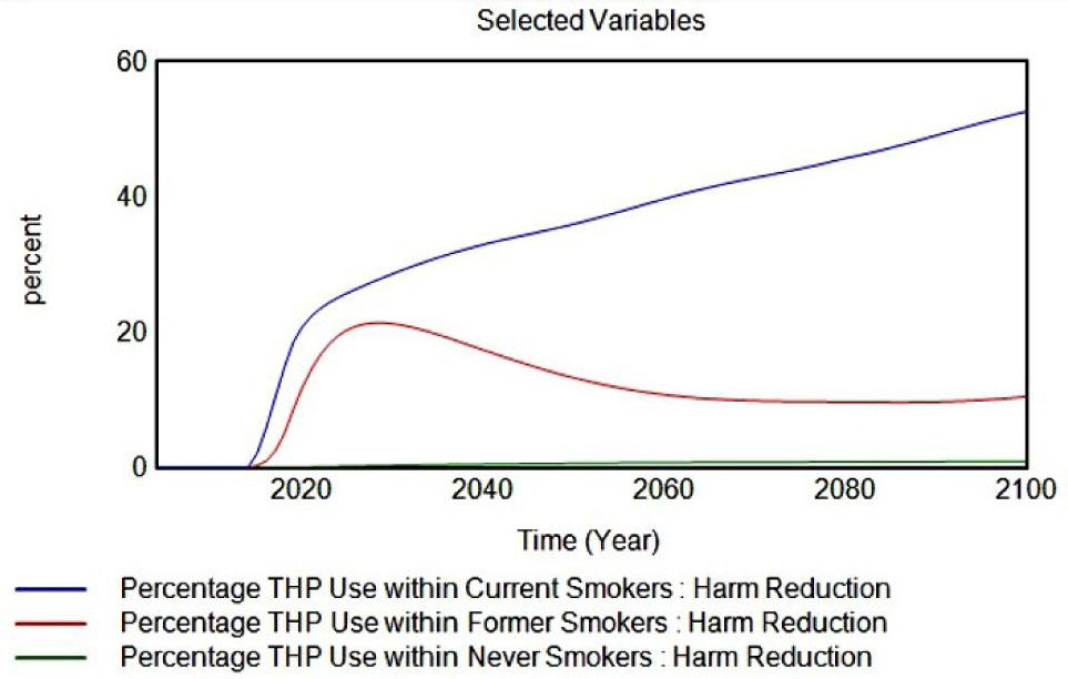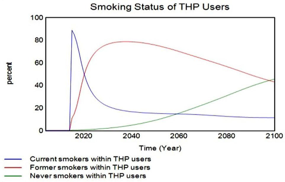 The projected number of THP users will peak around 2030 at just over 8.3 million, around 8.2% of the adult population. After 2030, THP users gradually decline to one million by 2100. Figure 10 shows that most of the early adopters of THPs were cigarette smokers. After many of the smokers had switched completely to THPs, former smokers became the dominant smoking status of THP users. By 2100, 45.5% of THP users had never smoked, 43.1% used to smoke 11.4% still smoked.