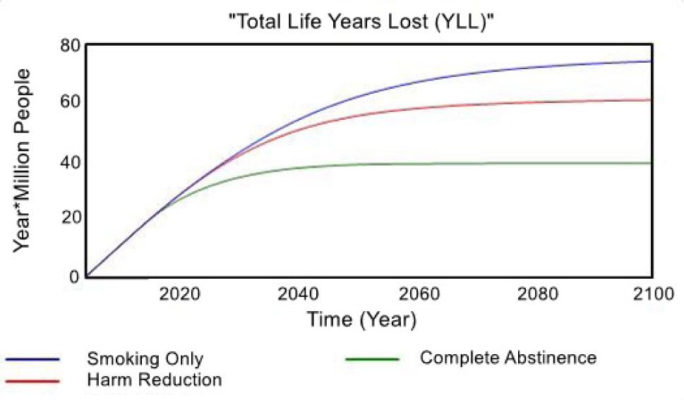 Compared to the Smoking Only scenario, 13.3 million fewer life years would be lost in the Harm Reduction scenario and 34.5 million saved if everyone were to cease tobacco product use in 2014.
