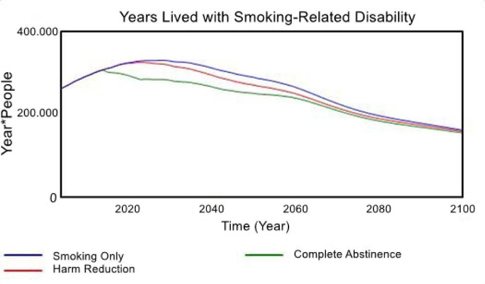 Individuals diagnosed with each disease are allocated a disability weight which reflects the loss of quality of life with each disease. The profile is similar across the three scenarios from 2080 onwards. Prior to then a greater number of years lived with a disability was observed in the Smoking Only scenario, followed by the Harm Reduction scenario and the best of all three was the Complete Abstinence scenario. Accumulating the years lived with a disability over 2004 to 2100 produced a total of 25.2 million, 24.3 million and 22.9 million from the Smoking Only, Harm Reduction and Complete Abstinence scenarios, respectively.