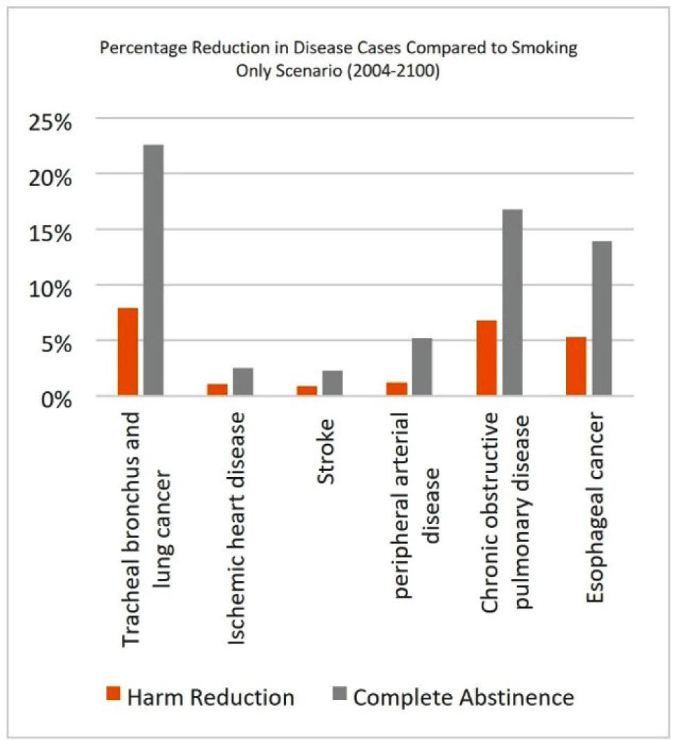 The greatest fall was seen in lung cancer cases, the major disease most linked to smoking, where complete abstinence would achieve a 22.6% reduction and the Harm Reduction scenario a 7.9% reduction.