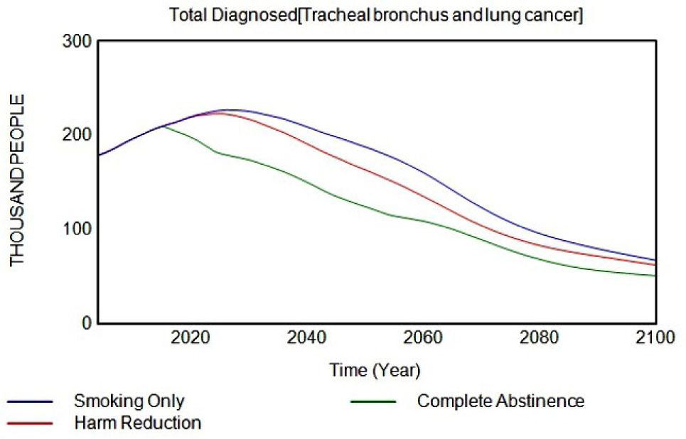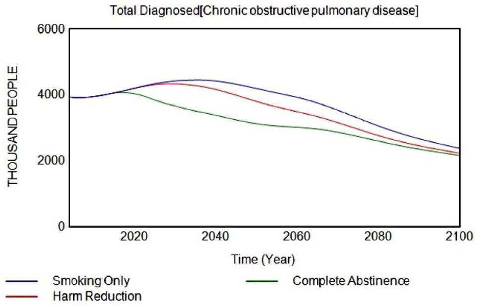 We estimate through the above model that by the year 2100 the introduction of THPs into the Japanese marketplace will reduce future smoking prevalence, reduce the number of smoking-related premature deaths by 850,000 people and also reduce the burden of smoking-related disabilities by 880 thousand person-years, compared to a scenario where THPs had not been introduced. The Harm Reduction scenario projected that 14.2 million fewer disability life-years would be incurred compared to the Smoking Only scenario. The diseases with the highest reductions were lung cancer and COPD, the two major diseases most highly associated with smoking. We estimate that by 2100, the introduction of THPs will reduce the number of cases of lung cancer by 575,000 and COPD by 1,972,000. The scenarios projected by the RRP2 model indicate there will be significant benefits, not only premature lives lost, but also in the burden of disease borne by individuals.