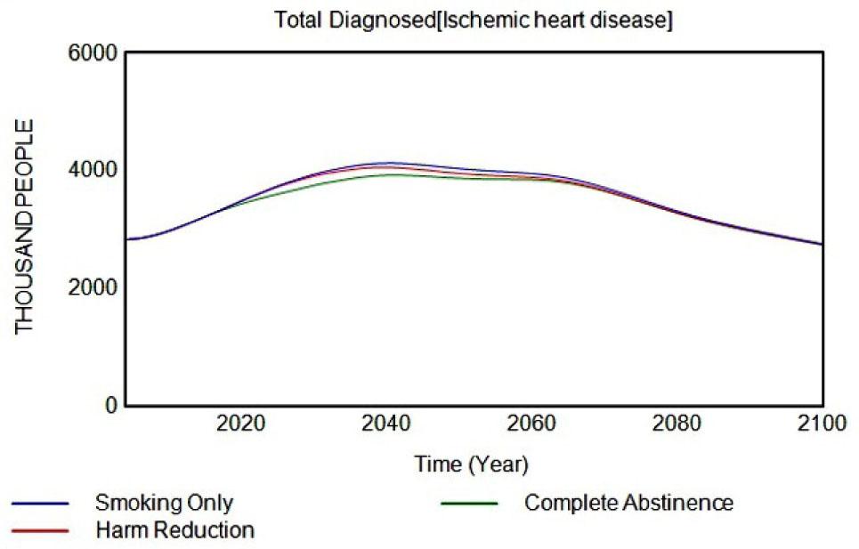 In each of the six smoking associated diseases modelled, the annual disease incidence rate was lower in the ‘Harm Reduction’ scenario than the Smoking Only scenario, but higher than in the Complete Abstinence scenario. The cumulative reduction in incidence over the 2004–2100 period varied considerably by disease. Lung cancer showed the biggest fall at 7.9%, followed by COPD at 6.7% and esophageal cancer at 5.2%. The fall in disease cases for ischemic heart disease, stroke and lower extremity peripheral arterial disease were 1.0%, 0.9% and 2.6%, respectively.