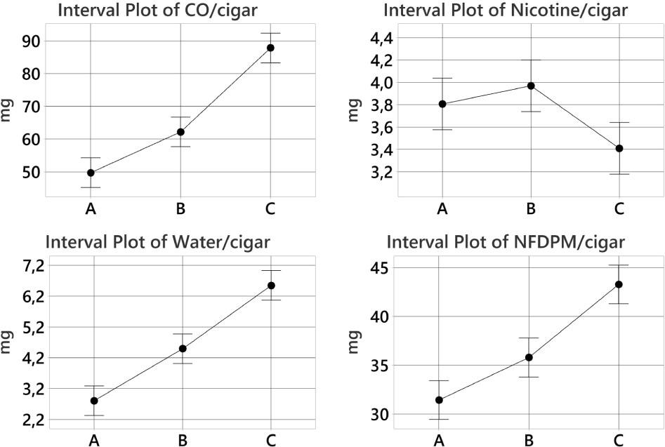 Plots of means and 95% CI, expressed in mg/cigar, of CO, nicotine, water and NFDPM in mainstream smoke of A, B, and C Cigars.