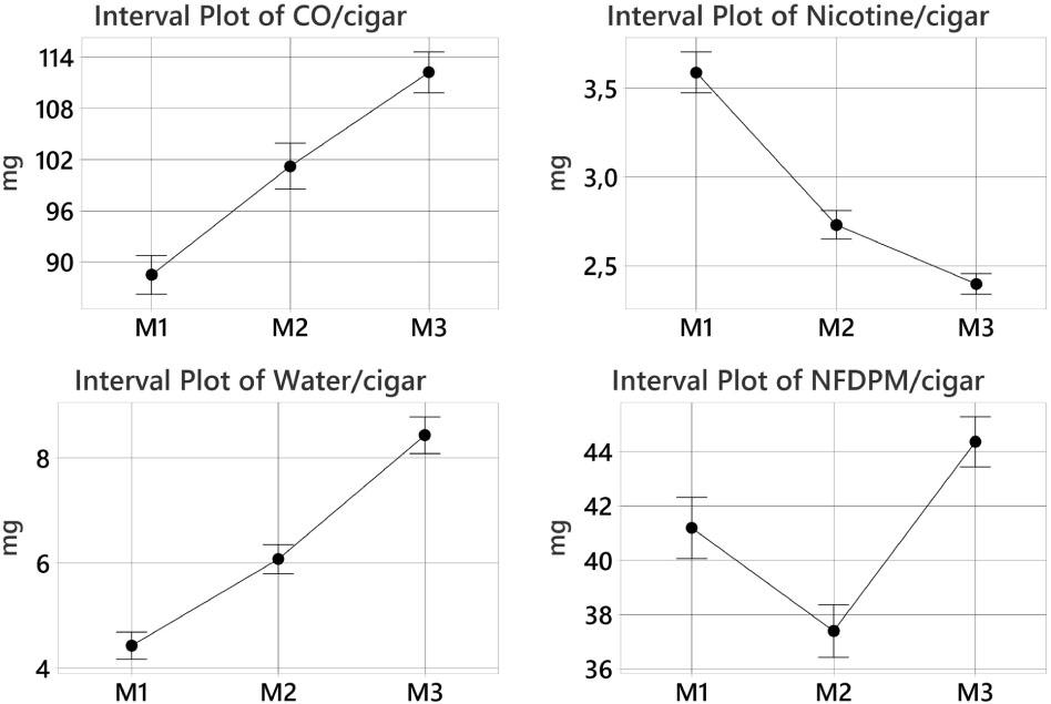Mainstream smoke yields of CO, nicotine, water, NFDPM, TPM and puff number for M1, M2 and M3 cigars_ Given are the mean values and 95% confidence intervals (CI) in mg/cigar_
