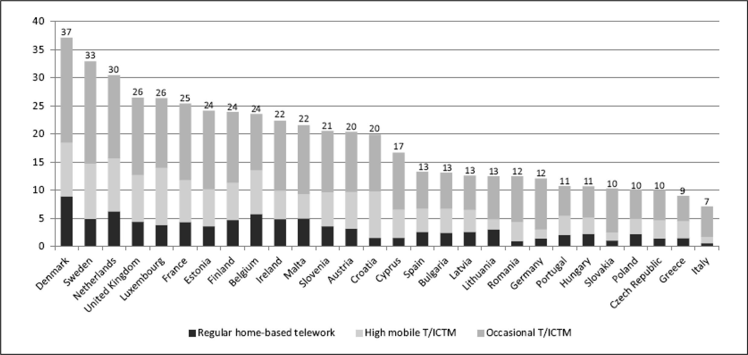 Comparing European countries there is a noticeable significant difference between the North and Eastern Europe (except Germany), more than one third of the population uses the possibility of a minimally part time job from home a Southern and Eastern Europe where this trend is significantly lower (Eurofound and the International Labour Office, 2017).