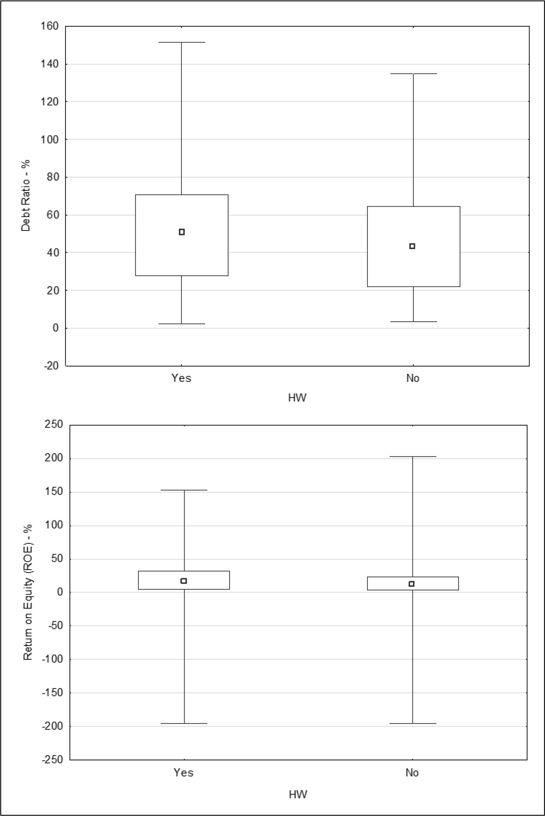 Based on our research, it is evident from boxplot 1 that the debt ratio of telework companies is higher than of non-telework companies. This can be caused mainly due to the field of industry, as telework companies are generally trading companies with a higher share of liabilities, while non-telework companies are primarily manufacturing companies. Their mean value is over 50%, whereas the mean value of the indicator for non-telework companies is over 40%. A further research showed that the highest debt ratio was in the wholesale, retail and services sectors (63.8% on average), as well as in the administrative activities (58.3% on average). On the contrary, the lowest debt ratio is found in farms (48% on average), construction enterprises (51.7% on average) and manufacturing enterprises (54.1% on average). These values confirm not only the hypothesis that telework companies have higher debt ratio, respectively they use more liabilities but also that non-telework companies are mainly manufacturing companies, construction companies and agricultural enterprises.