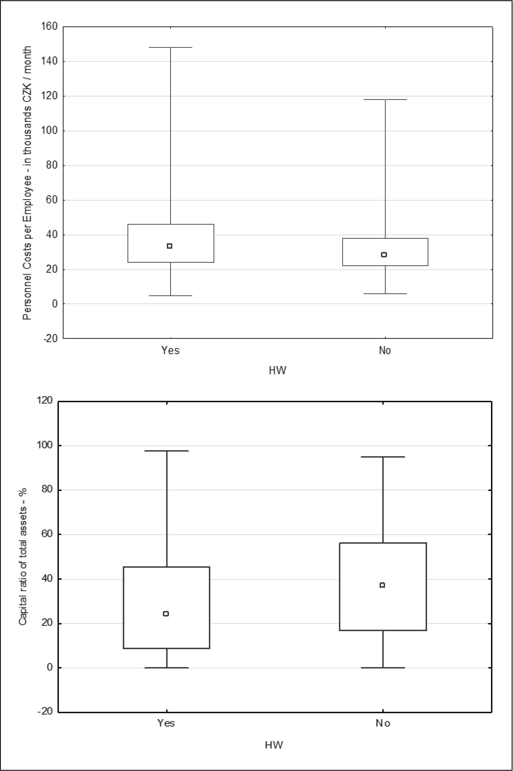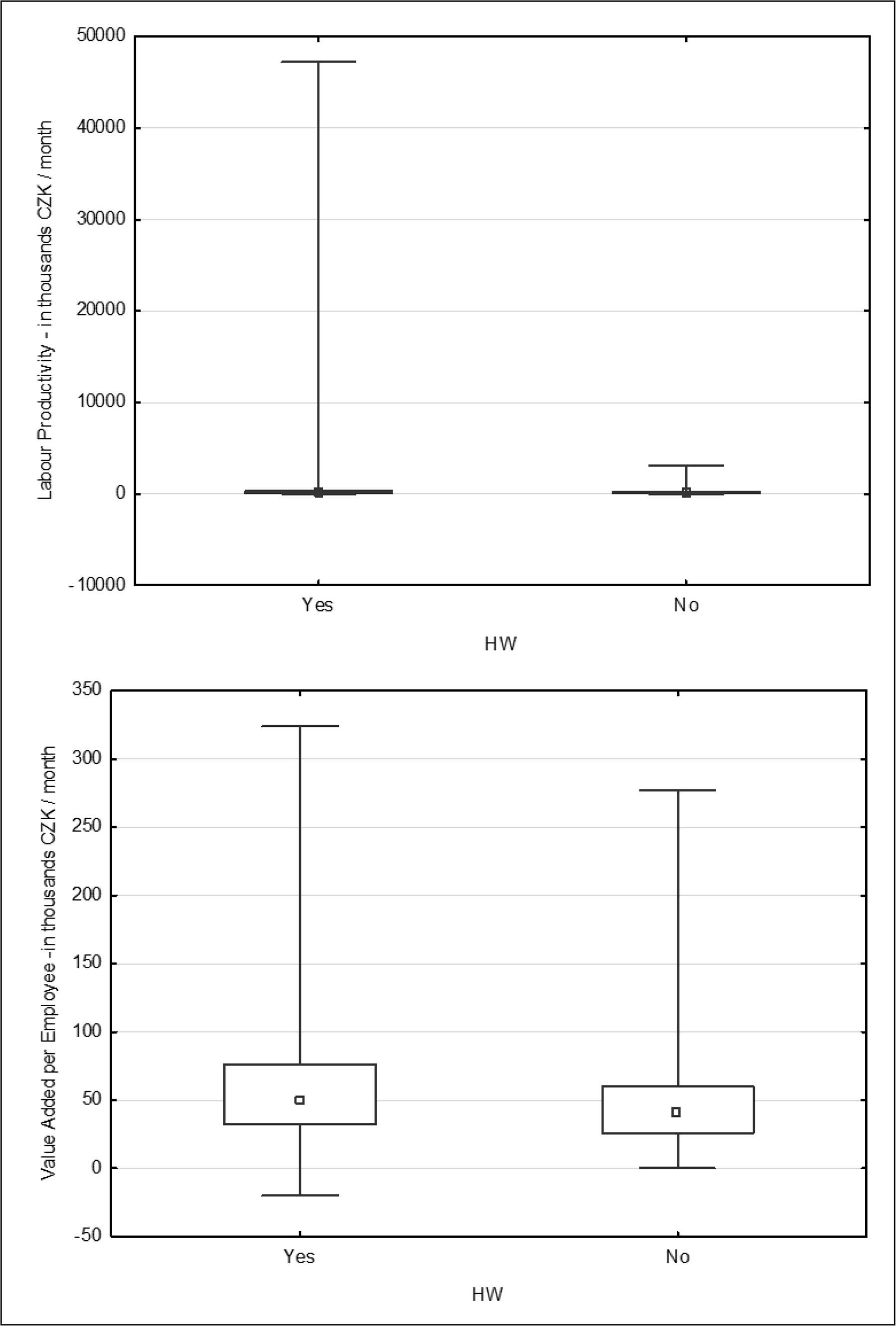Added value is an economic indicator measuring the company’s financial performance. Simply said, this is the difference between the net operating profit achieved and the total cost of capital (Helfert, 2001). If we relate this figure to the number of employees, we will get the added value of human capital (Kislingerová, 2010). According to the research, the value added per employee for telework companies is higher than for non-telework companies – see boxplot 2. This may be since these companies achieve higher incomes (the analysis of this indicator is confirmed by the validity of the previous productivity indicator, where telework companies achieve higher sales and hence higher incomes). Their mean value is more than CZK 50,000.00 per month, while the mean value of the indicator for telework companies is around 40,000.00 CZK per month. In this way, it is certainly not possible to monitor the added value of each individual employee, but the figure of the mean value added of human capital is a very important benchmark of an enterprise with its competitors.