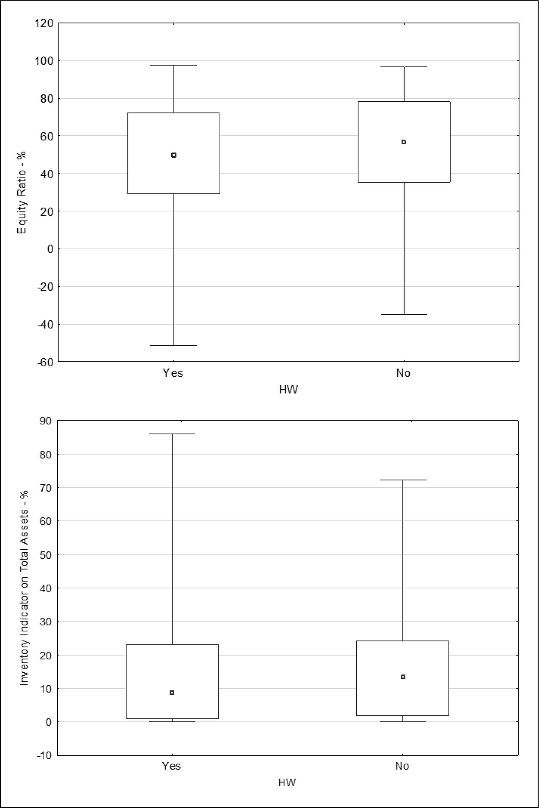 Inventory indicator on total assets in % is calculated as the ratio of inventories to total assets. This indicator is higher in the case of manufacturing enterprises and, as mentioned above, these enterprises do not usually use telework. Simultaneously, the indicator also corresponds to the indicator of the equity ratio, because the enterprises with a higher ratio of fixed assets also have a higher ratio of inventory. The average value of the indicator for non-telework companies is almost 15%, whereas the average value of the indicator for telework companies is only around 9% – see boxplot 4.