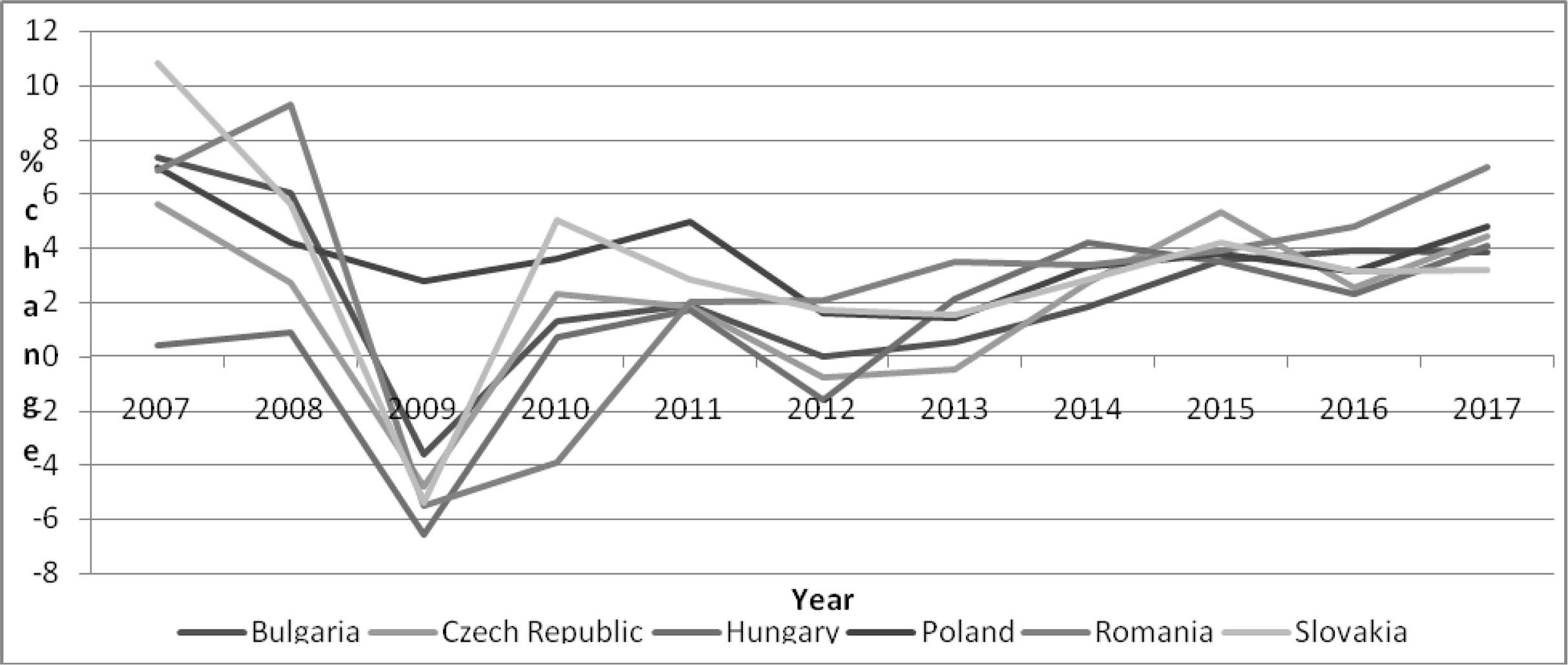 The evolution of the GDP, that stands for the development of the business cycle (Figure 1) shows that the considered CEE countries (i.e. the Czech Republic, Hungary, Poland, Slovakia, Romania and Bulgaria) started to grow significantly, following the same track after 2000. Nevertheless, a more sustainable trend is noticeable for Poland, which did not record the same severe down slope in 2009 as the rest of the countries. After the crises, all six economies were stabilised, growing at similar paces, above the average EU 28 growth rate of 2.3%. This trend confirms the β-convergence theory and that, as a group, the CEE countries may catch up with the rest of the developed EU countries. The lack of pre-crises convergence can be mainly explained by the lack of supportive incentives for innovation and low productivity.
