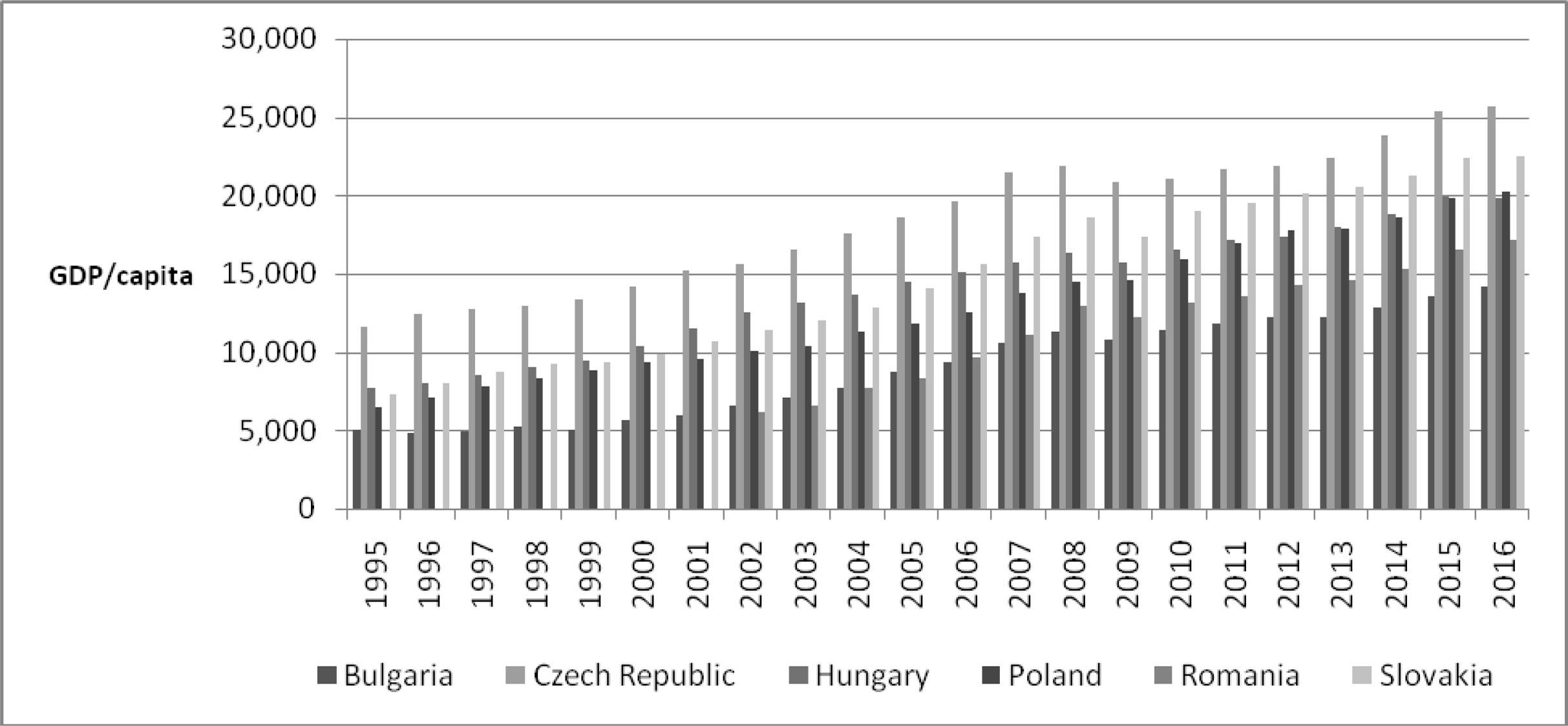 Complementarily, the GDP per capita (Figure 2) shows a higher convergence for the Visegrad countries, Romania and Bulgaria lagging behind, since other determinants become prevalent such as labour productivity, the quality of institutional governance and demography. A lower ranking of GDP per capita is due to a mix of factors, i.e. ineffectiveness of governance, the inadequate regulatory environment, the size of informal economy.