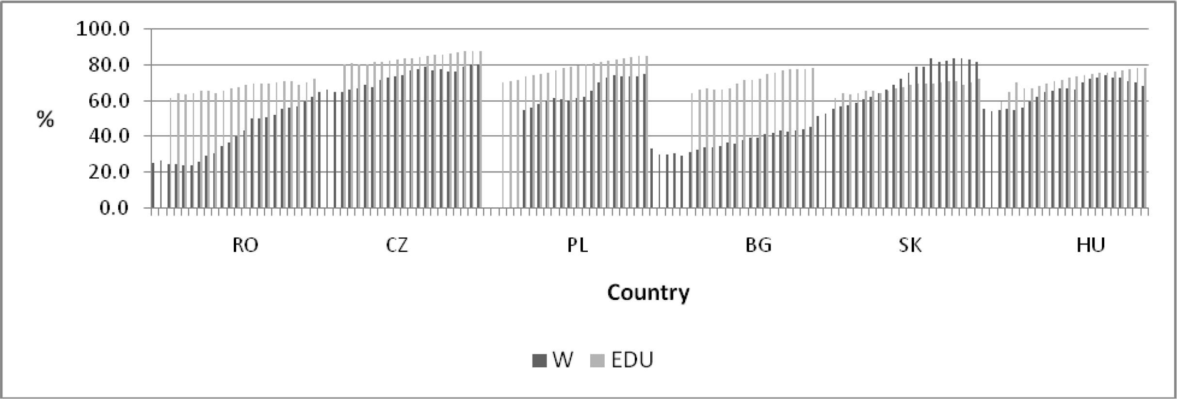 Labour productivity is a main trigger of convergence and heavily relies on the quality of labour as an outcome of education (Figure 4). As statistics show, in Slovakia and Hungary there is a better correlation between the educated labour force (upper secondary and tertiary) and labour productivity. It means that spending on education is more efficient, supporting productivity transfer towards businesses. In Slovakia the quality of education is reflected in the increased productivity (highest effectiveness), in Hungary the gap between these indicators is narrow, while in the Czech Republic, Poland and Romania although productivity does not fully reflect the investment in labour force, the situation is rapidly improving, whilst in Bulgaria the gap is still considerable.